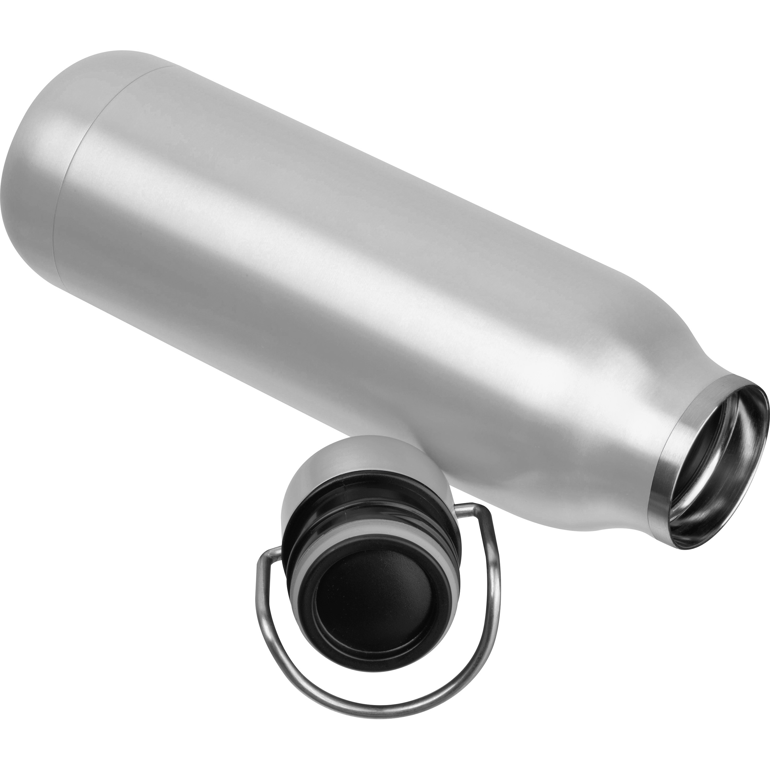 Doppelwandige Vakuum Trinkflasche aus Edelstahl mit Tragegriff am Deckel und einem Fassungsvolumen von 600 ml. Ihre Werbung bringen wir mittels einer Lasergravur auf der Flasche an.