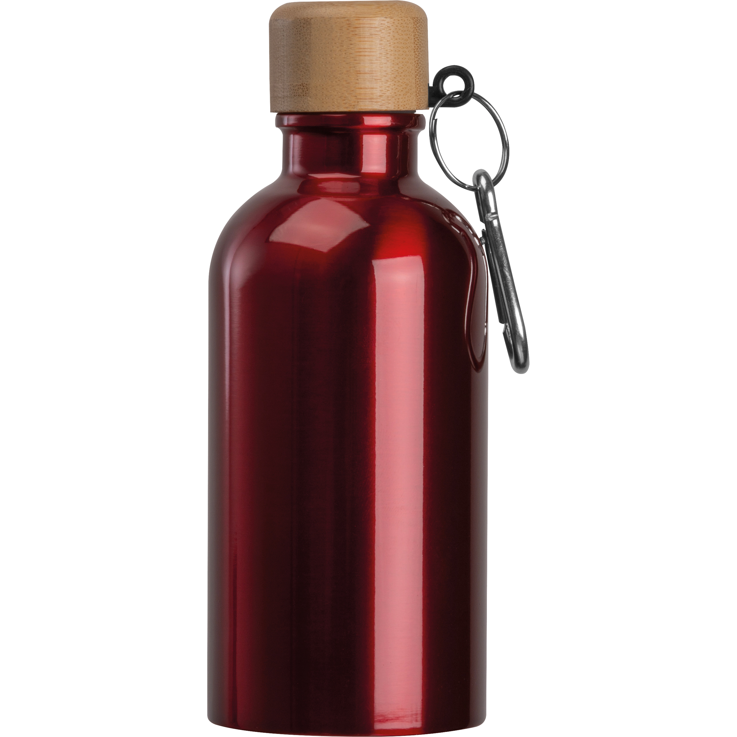 Kleine Edelstahltrinkflasche mit praktischem Karabiner, einem Füllvermögen von 400ml und einem auslaufsicheren Drehverschluss mit Bambusdeckel. Ihre Werbung gravieren wir auf die Flasche