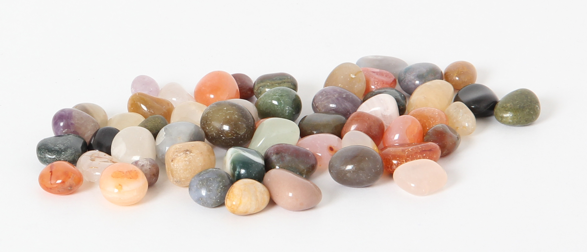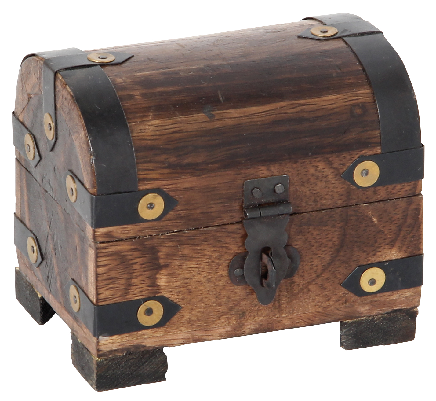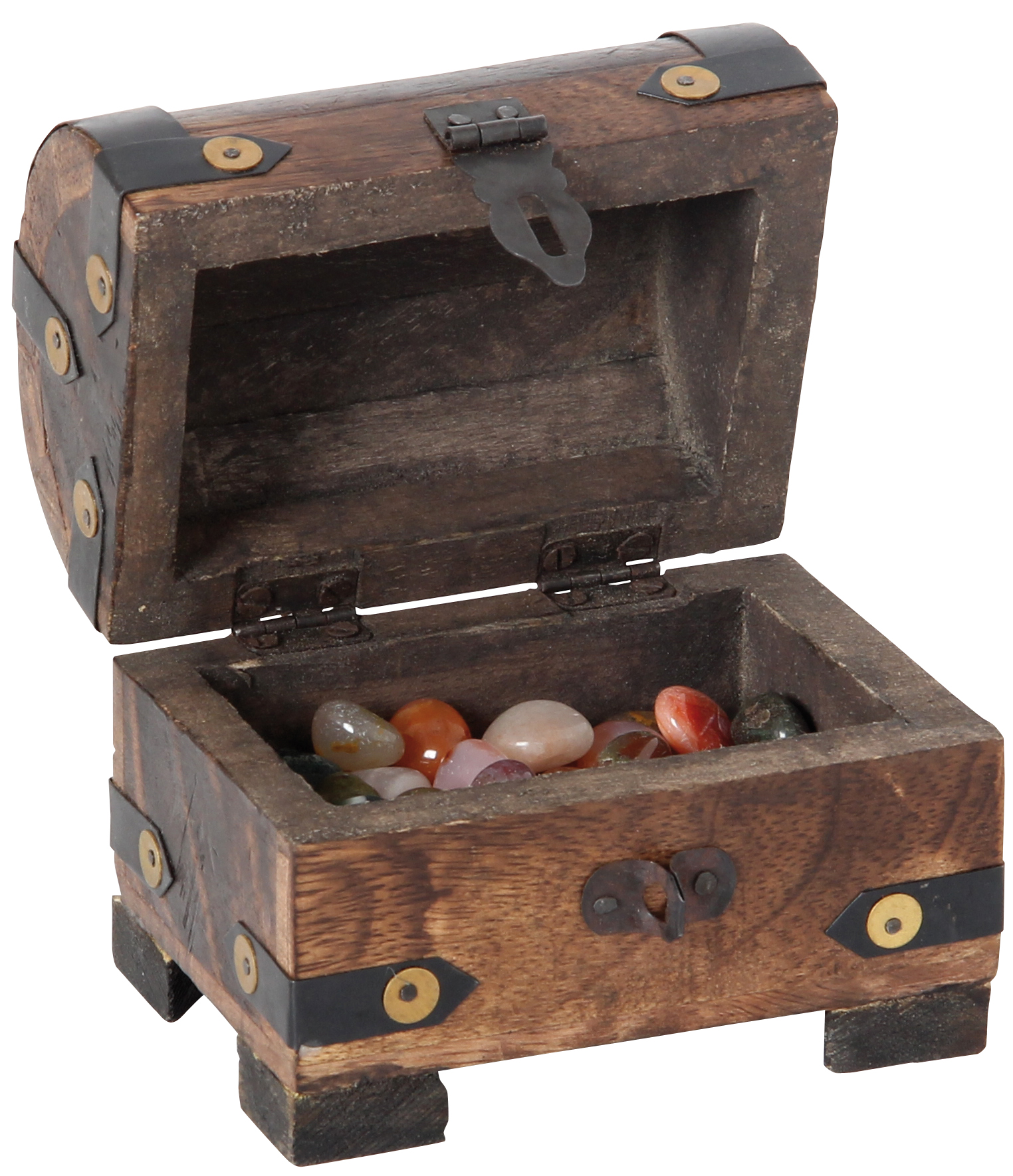 Rustikale Schatztruhe aus Mangobaumholz mit dunklen Metallbeschlägen und messingfarbenen Nieten. Gefüllt ist die Truhe mit Trommelsteinen aus vielen verschiedenen Mineralien und Halbedelsteinen wie Achat, Amazonit, Amethyst, Aventurin, Bergkristall, Carneol, Japsis, Rosenquarz Sodalith oder Tigerauge.