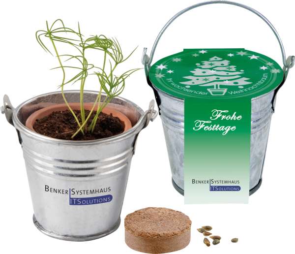 Das kleine Zinkeimerchen enthält ein Tontöpfchen, Erdtablette und Samen (Fichte) zur Anzucht der Pflanze. Der Werbeeindruck ab 250 Stück ist auf dem Standardmotiv der Banderole möglich. Eine eigene Gestaltung der Banderole ist bereits ab 250 Stück möglich.