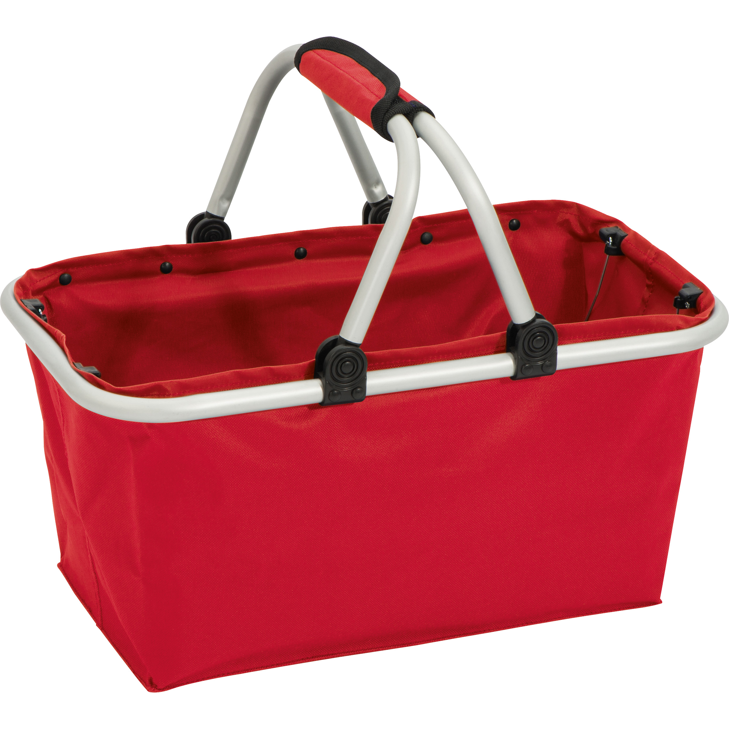 Faltbarer Einkaufskorb aus Polyester und Aluminiumgestänge. Ein nützlicher Begleiter, der sich zusammengefaltet platzsparend lagernd lässt. Ihre Werbung drucken wir auf eine Seite.