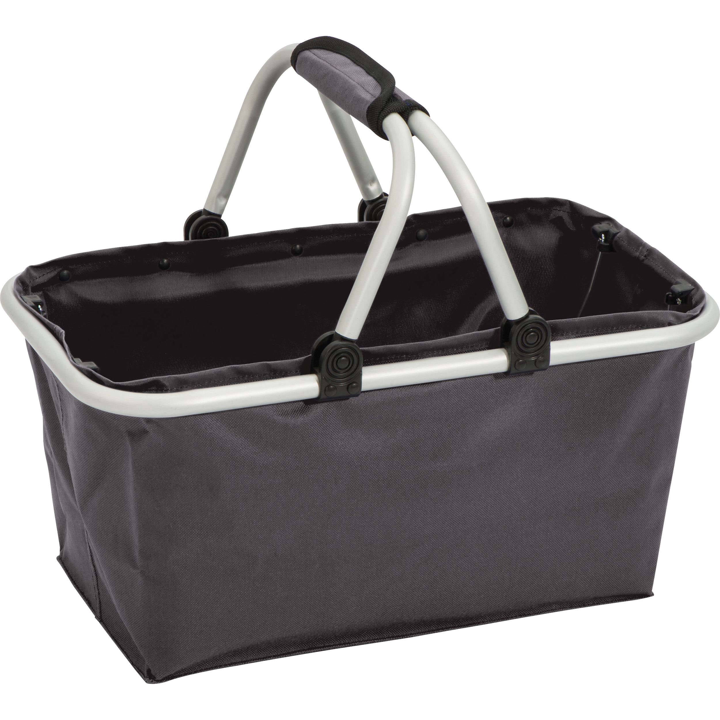 Faltbarer Einkaufskorb aus Polyester und Aluminiumgestänge. Ein nützlicher Begleiter, der sich zusammengefaltet platzsparend lagernd lässt. Ihre Werbung drucken wir auf eine Seite.