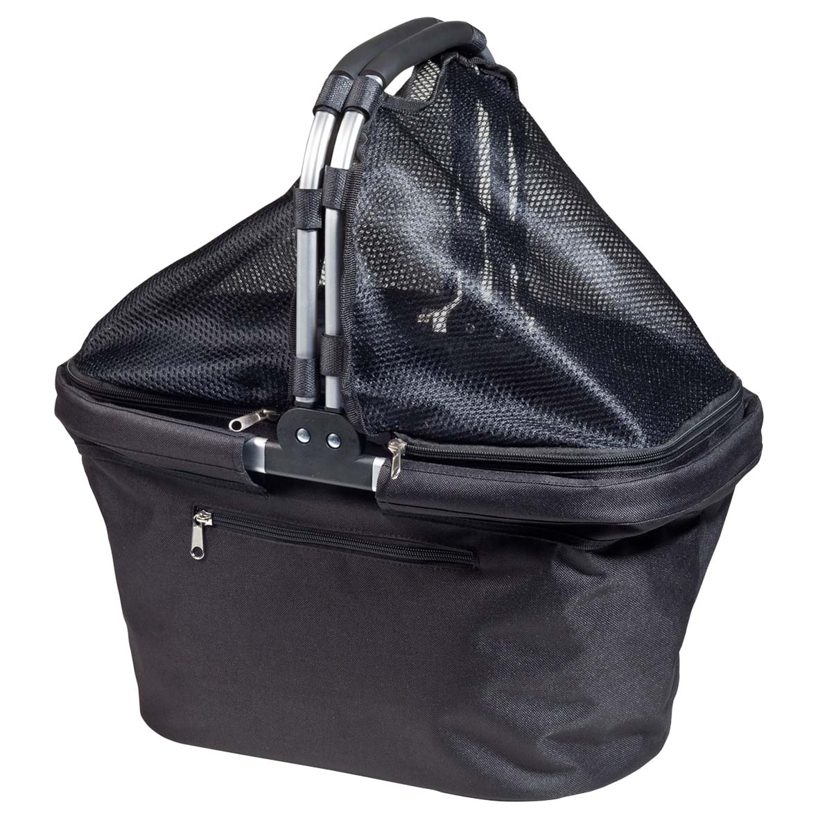 Da fällt nichts mehr raus. Toller, stabiler Einkaufskorb mit Aluminium-Gestell und Polyester-Bespannung, inkl. Reißverschlussfach außen und festem Boden. An den zwei klappbaren Henkeln können zwei Netze mittels Klettbändern befestigt werden. Dadurch vergrößert sich das Füll-Volumen um 30 %. Am Korb selbst sind die Netze mittels Reißverschluss angebracht. Praktisch und flexibel zugleich.