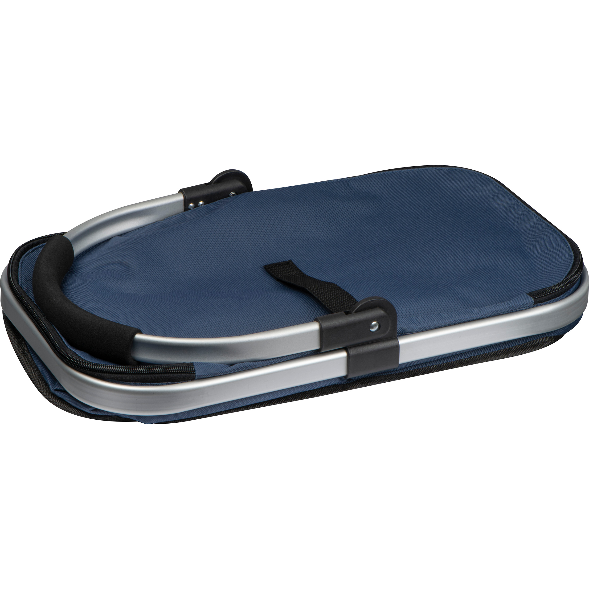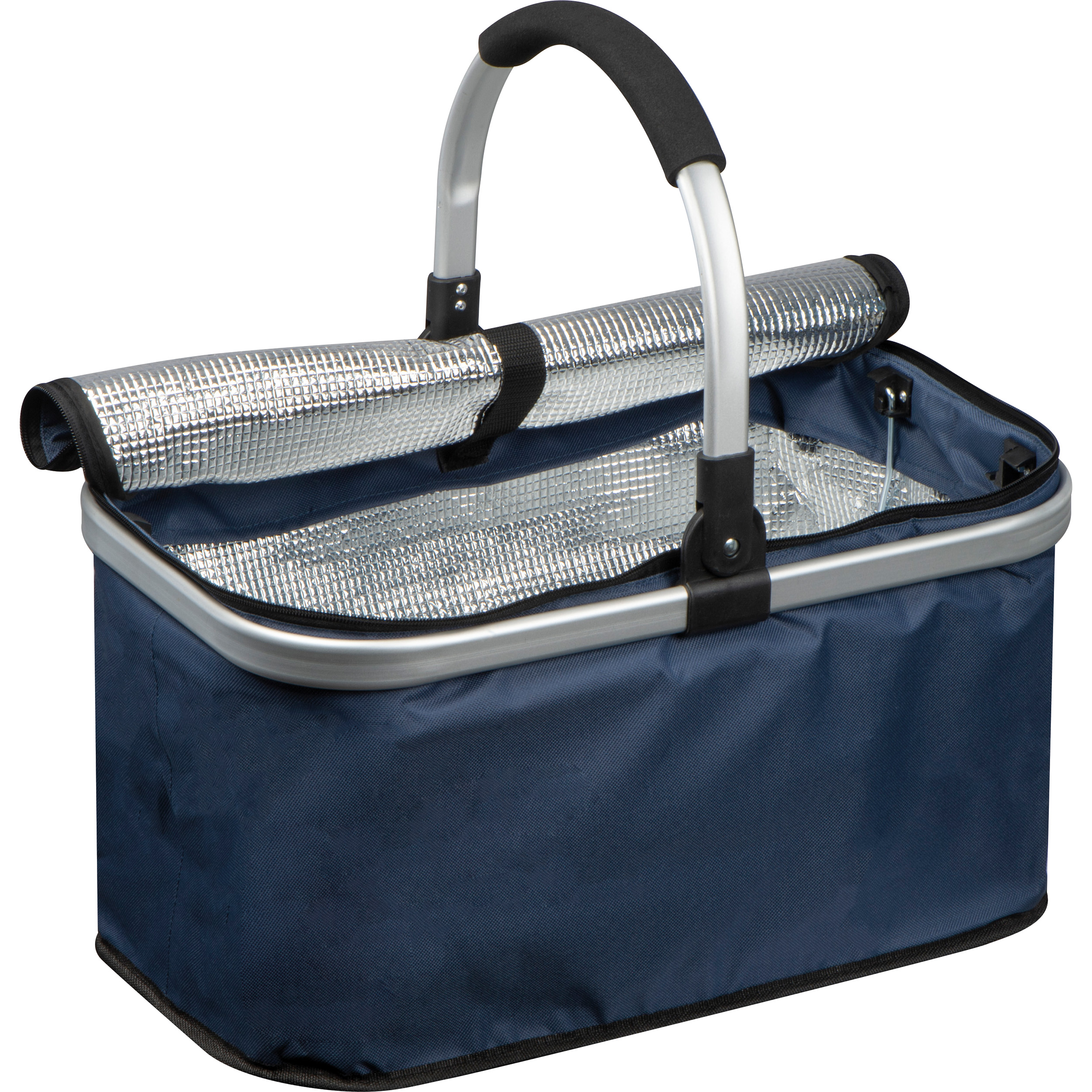 Handlicher Einkaufskorb aus Polyester mit Kühlfunktion und einem einklappbaren Tragehenkel aus Aluminium. Der Korb lässt sich leicht zusammenklappen und hat ein Tragevolumen von 15kg. Der Druck wird mittig auf einer Seite angebracht.