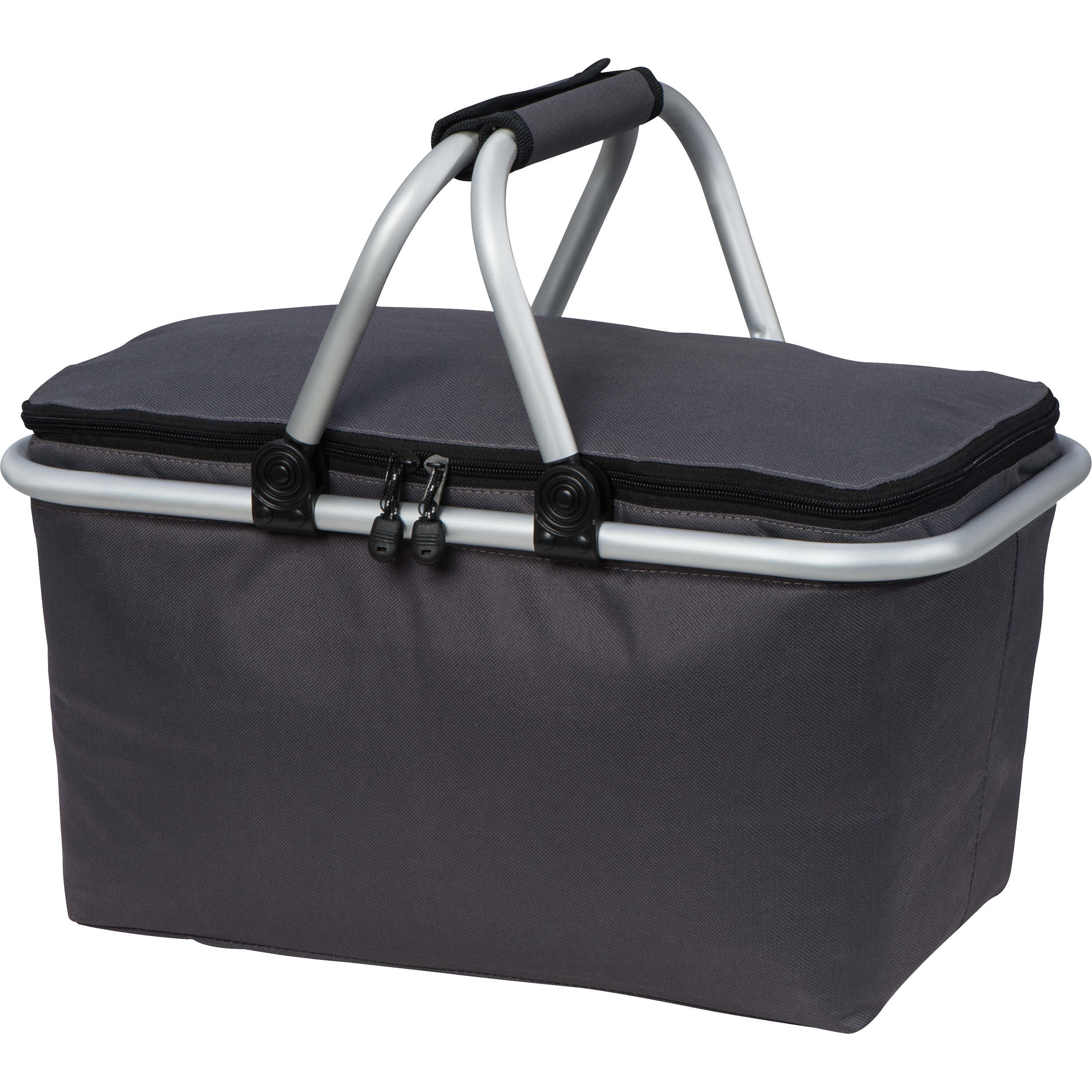 Faltbarer Einkaufskorb aus Polyester mit Isolierfunktion und Aluminiumgestänge. Ein nützlicher Begleiter, der sich zusammengefaltet platzsparend lagernd lässt. Ihre Werbung drucken wir auf eine Seite.