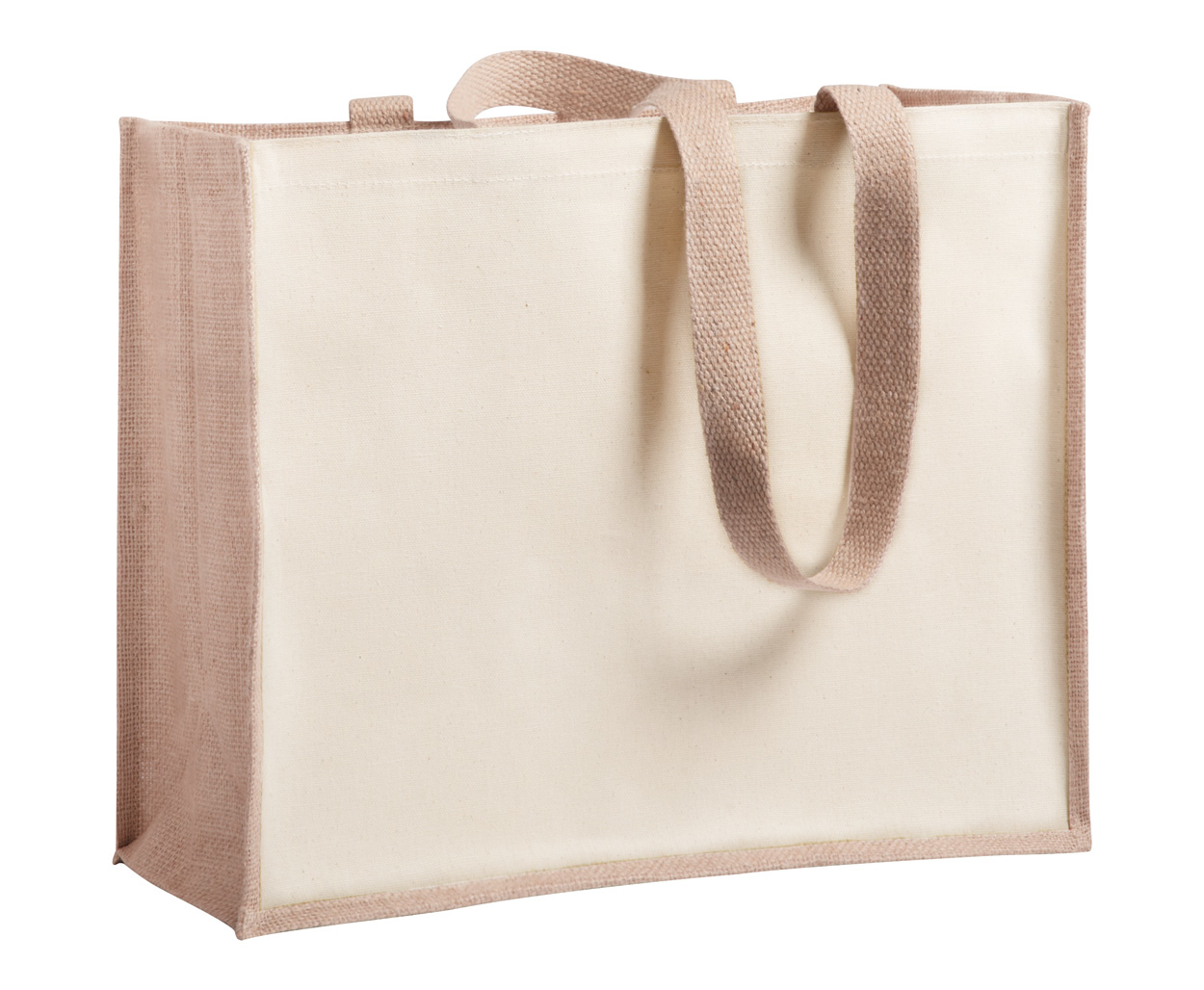 Einkaufstasche mit langen Henkeln. Material Jute und Baumwolle, laminiert.