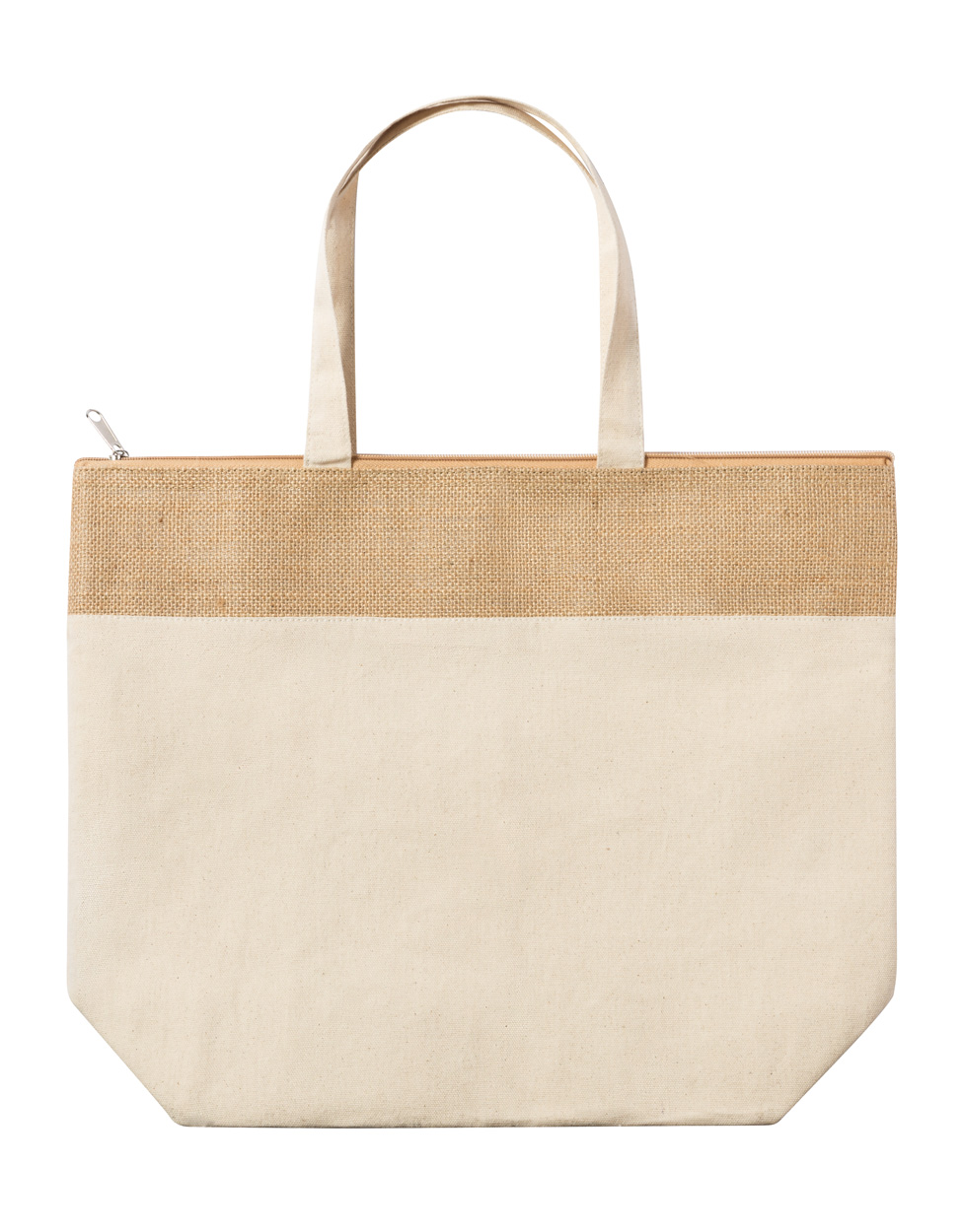 Kühltasche mit Aluminiumpolsterung und Reißverschlussfach. Material: 100 % Baumwolle und laminierte Jute.