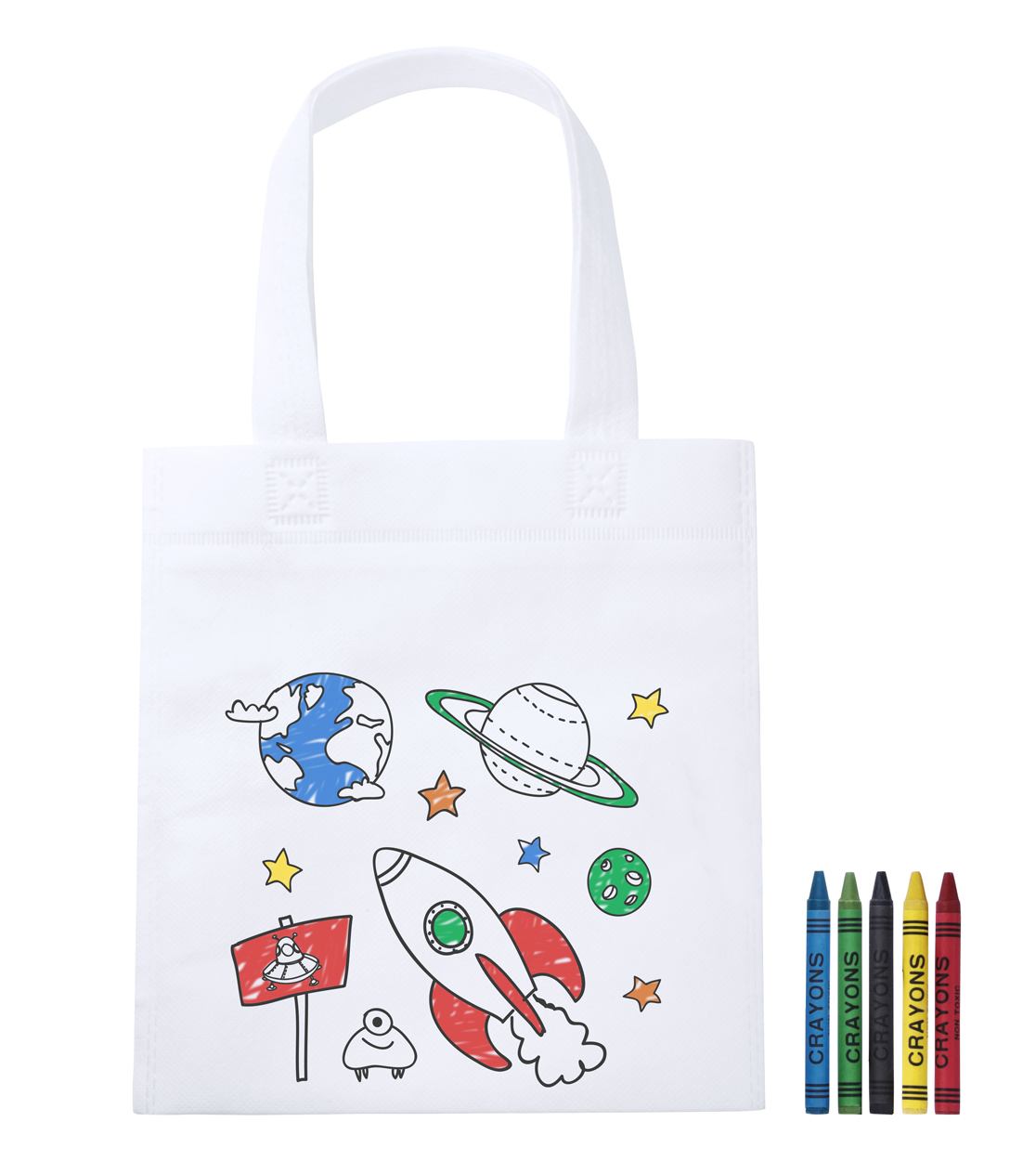 Non-Woven Einkaufstasche für Kinder zum Ausmalen, mit 5 Wachsmalstiften.