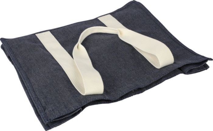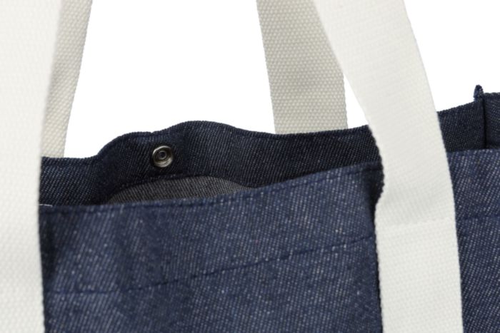 Einkaufstasche aus Denim (280 g / m2) mit 15 Zentimeter langen Zwickeln und langen Griffen aus Canvas (280 g / m2). Das Denim-Material besteht aus 65% Polyester und 35% Baumwolle. Mit einem Druckknopf zum Schließen der Tasche. Die Farbechtheit von Denim beträgt bis zu 2-3 Stufen.