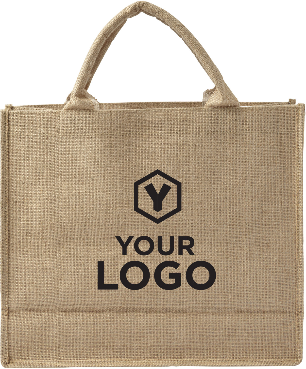 Shopper aus Jute mit kurzen Henkeln, Boden- und Seitenfalte sowie laminierter Innenseite.