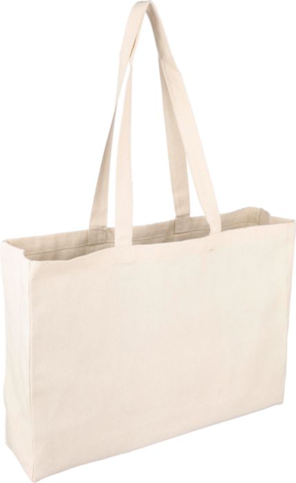 Einkaufstasche aus Oeko-Tex® Baumwolle (280 g / m2) mit 10 cm Seitenfalte. Natürliche Baumwolle. Maximales Tragegewicht: ca. 8 kg. Inklusive Oeko-Tex® Label.