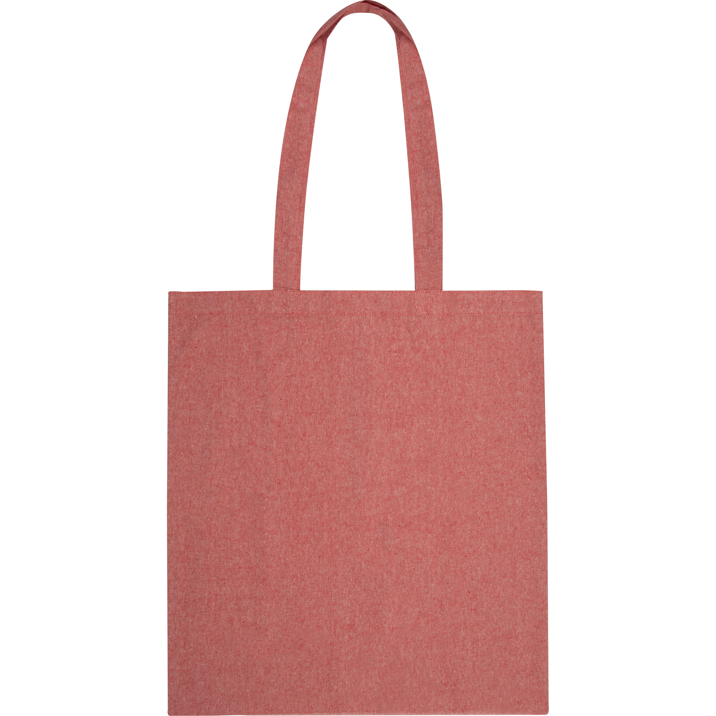 Oeko-Tex® STANDARD 100 zertifizierte Einkaufstasche aus recycelter Baumwolle mit langen Tragehenkeln und einer Grammatur von 140g / m². Die Werbung wird auf eine Seite der Tasche gedruckt.