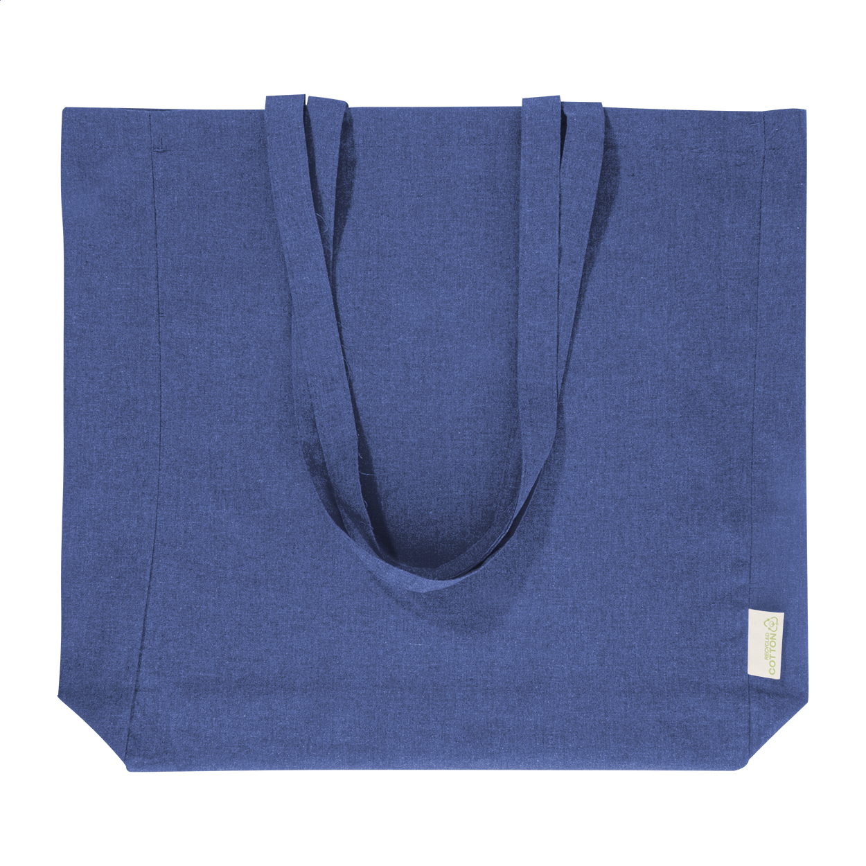 Einkaufstasche mit Seitenfalte und langen Henkeln. Material: 70% recycelte Baumwolle und 30% RPET Polyester, 140 g / m². Mit Label RPET.