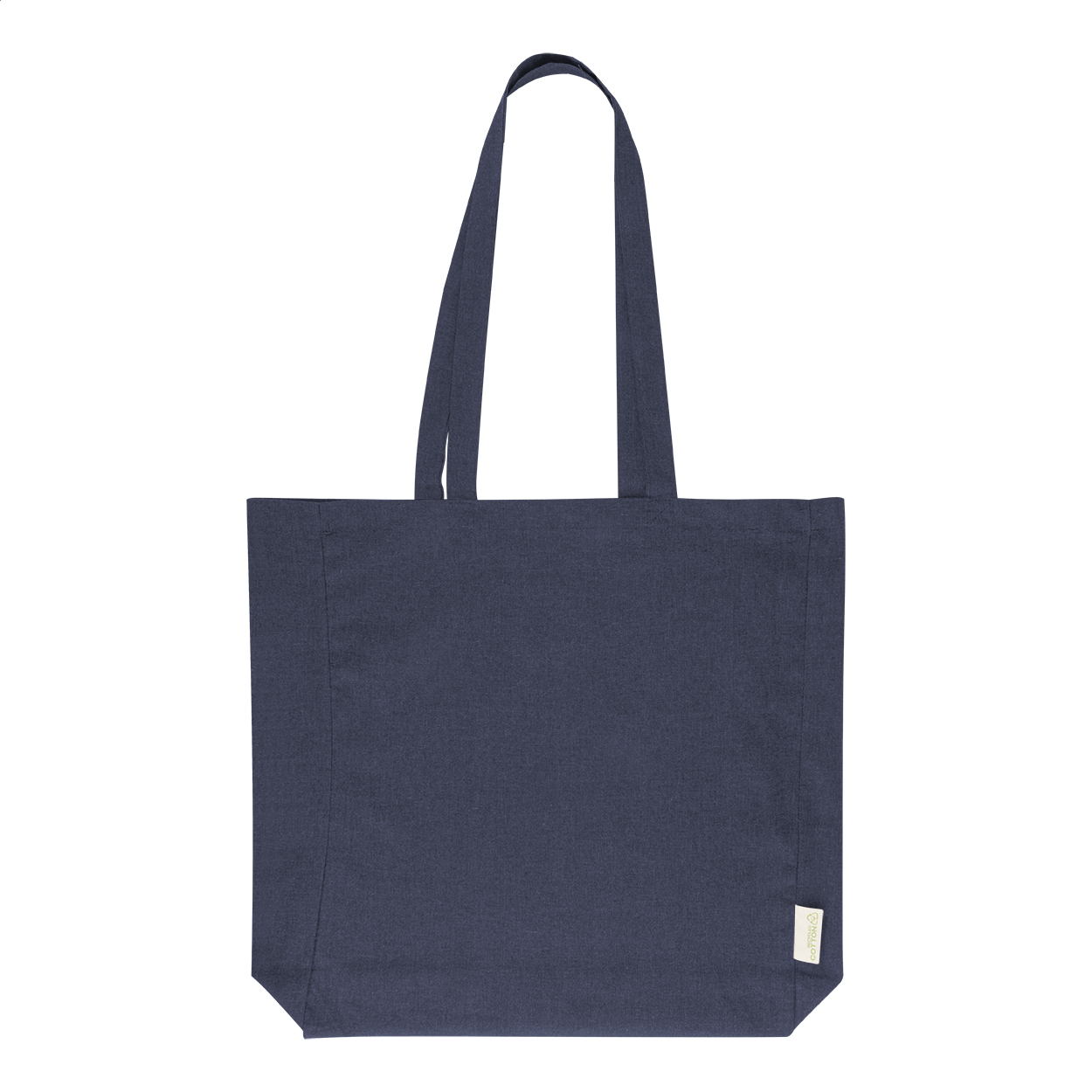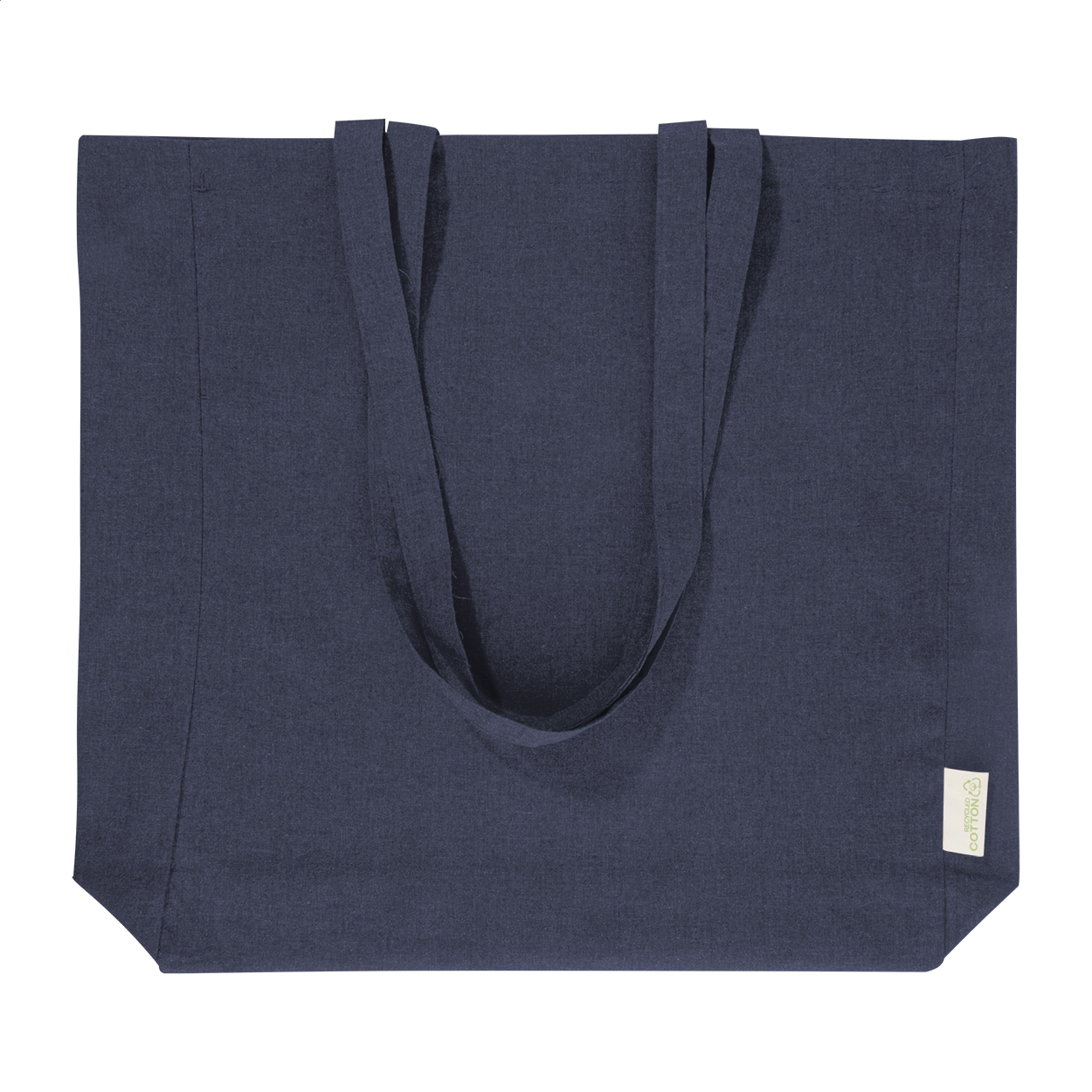 Einkaufstasche mit Seitenfalte und langen Henkeln. Material: 70% recycelte Baumwolle und 30% RPET Polyester, 140 g / m². Mit Label RPET.
