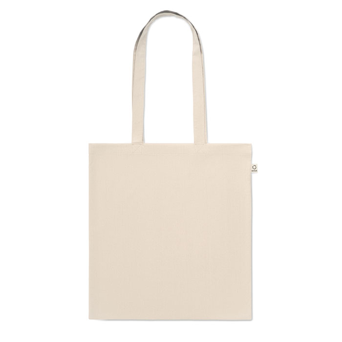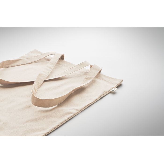 Einkaufstasche aus recycelter Post-Consumer-Baumwolle (70 % recycelte Baumwolle und 30 % RPET) mit langen Tragegriffen. 140 g / m². Artikel kann nach dem Bedrucken schrumpfen.