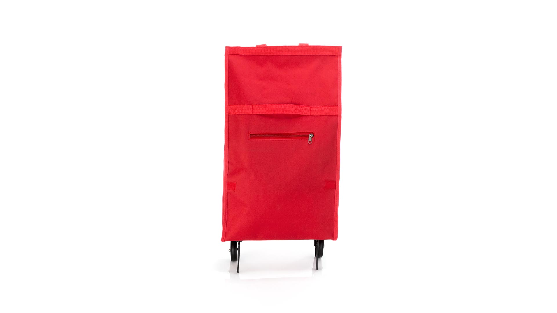 Faltbarer Einkaufstrolley aus robustem 600D Polyester in kräftigen Farben. Mit farblich passenden, verstärkten Nylongriffen, Fronttasche mit farblich passendem Reißverschluss sowie Standbeinen aus Metall. Zusammenfaltbar auf kleine Größe.
