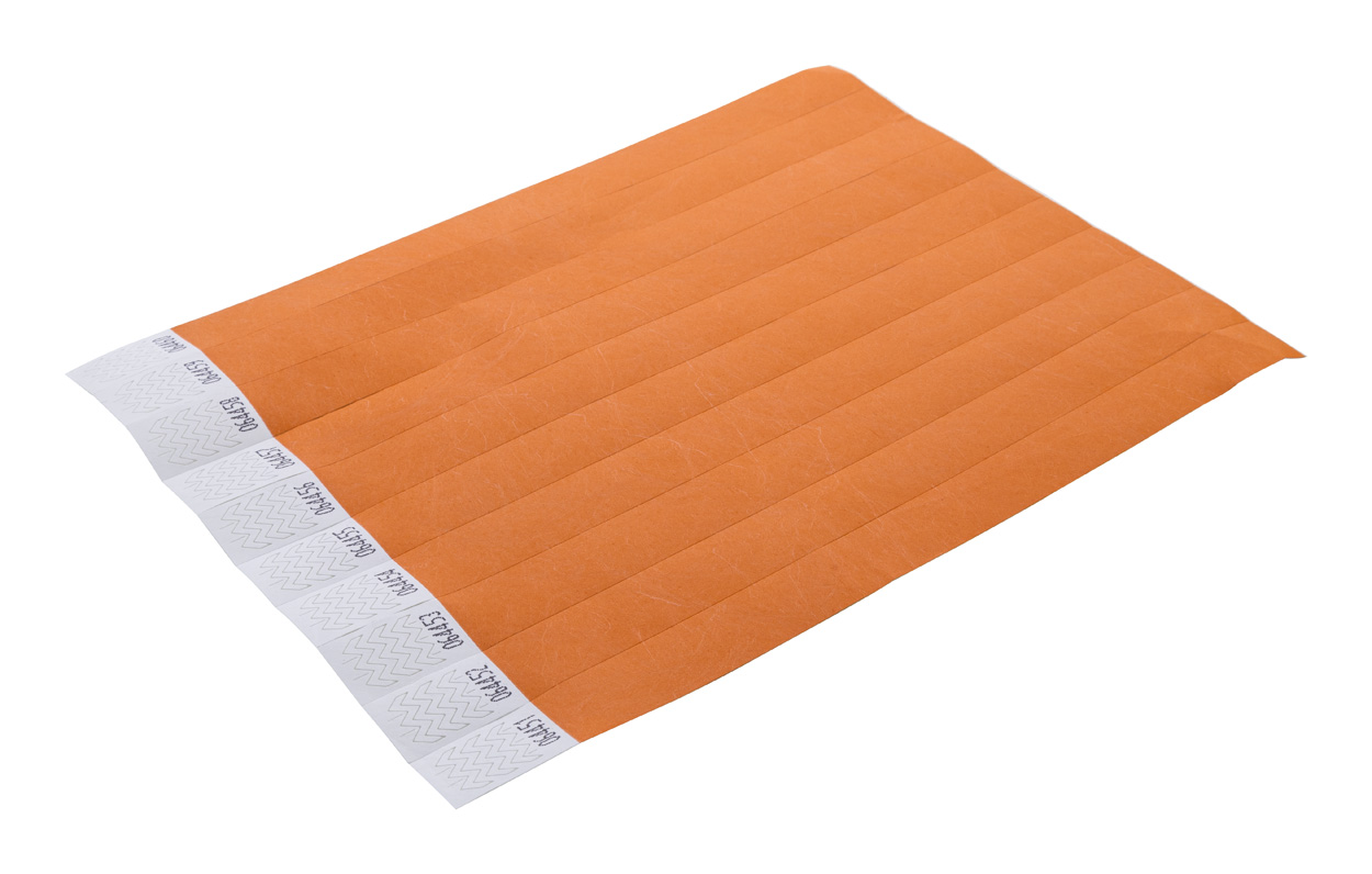 Ein Bogen mit 10 Tyvek-Armbändern, 19 mm breit, mit selbstklebendem Sicherheitsverschluss und fortlaufender Nummerierung.