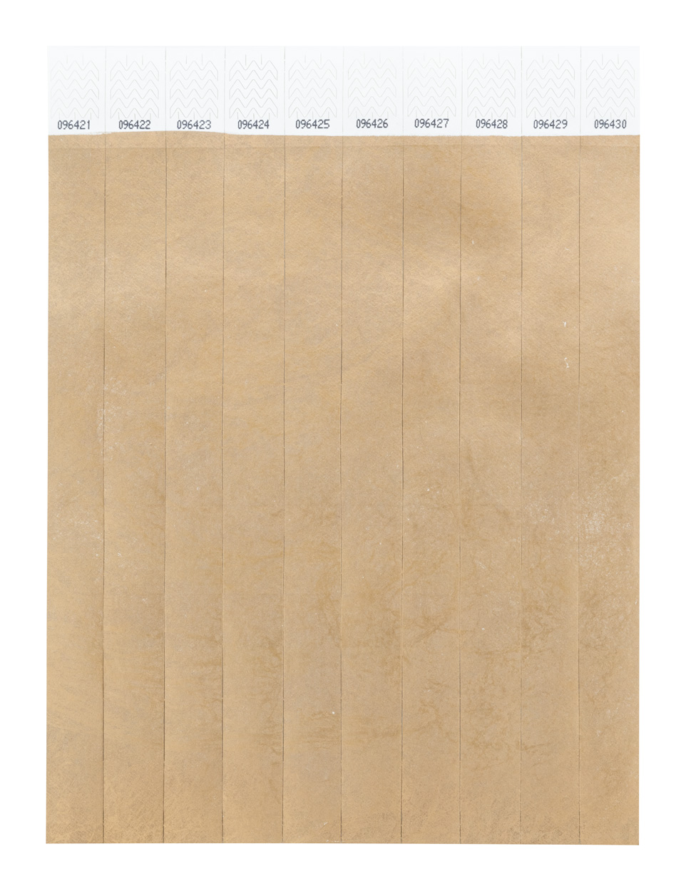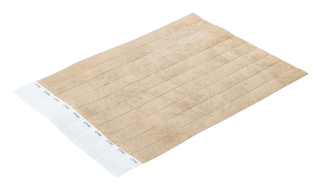 Ein Bogen mit 10 Tyvek-Armbändern, 19 mm breit, mit selbstklebendem Sicherheitsverschluss und fortlaufender Nummerierung.