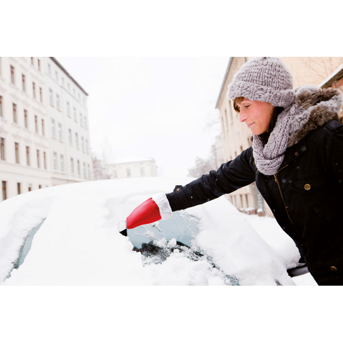 Handschuh mit integriertem Eiskratzer aus Kunststoff.