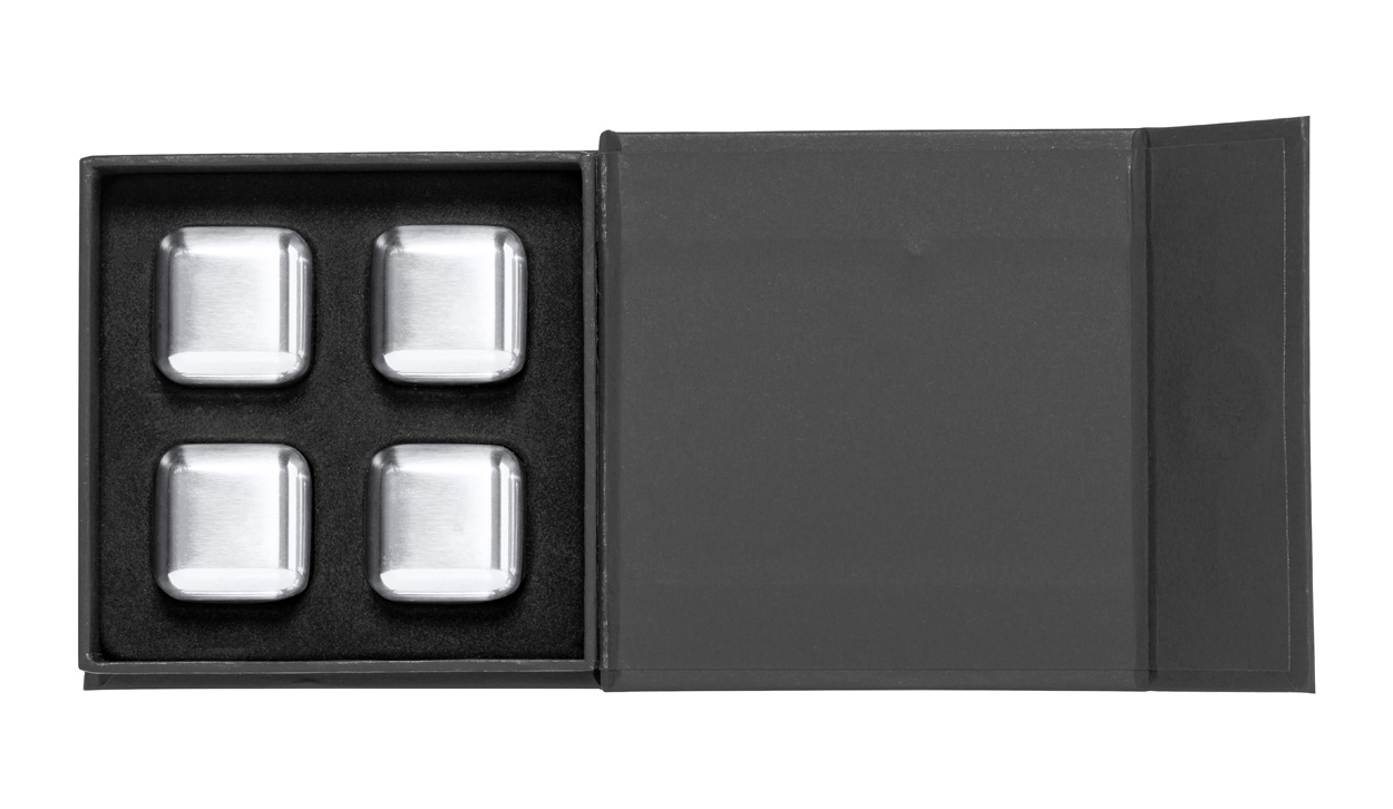 4-teiliges wiederverwendbares Eiswürfelset aus Edelstahl in schwarzer Geschenkbox.