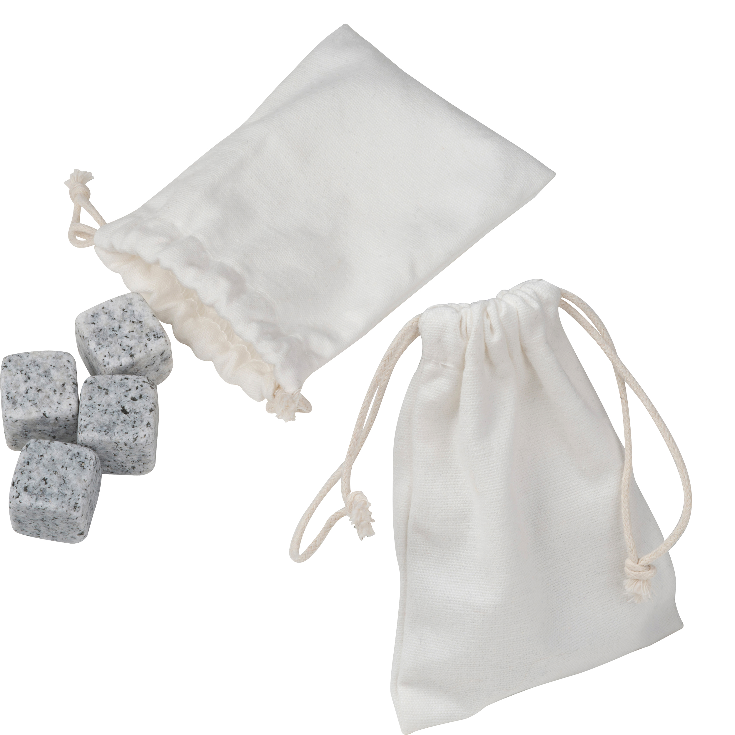 Set aus 4 hellen Eiswürfel-Steinen aus Granit, stilvoll verpackt in einem Baumwollsäckchen. Wiederverwendbar und perfekt, um Getränke ohne Verwässerung zu kühlen. Eine elegante Alternative zu klassischen Eiswürfeln! Ihr Logo wird per Siebdrucktransfer auf dem Säckchen platziert.