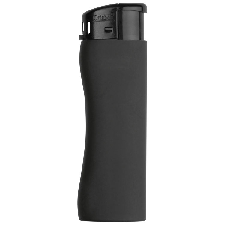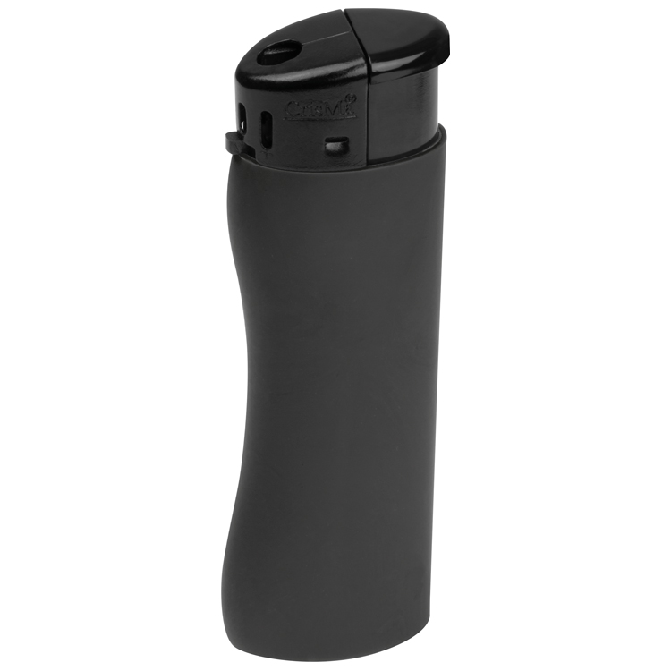Ergonomisches Elektronik Feuerzeug nachfüllbar mit Soft Touch Haptik. Die Flamme lässt sich stufenlos verstellen. Der Werbeaufdruck wird im Digitaldruck (mehrfarbig) für Rechtshänder lesbar angebracht.