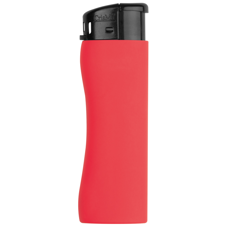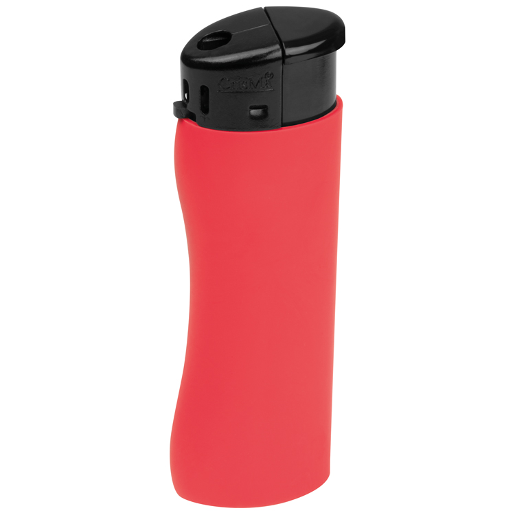 Ergonomisches Elektronik Feuerzeug nachfüllbar mit Soft Touch Haptik. Die Flamme lässt sich stufenlos verstellen. Der Werbeaufdruck wird im Digitaldruck (mehrfarbig) für Rechtshänder lesbar angebracht.