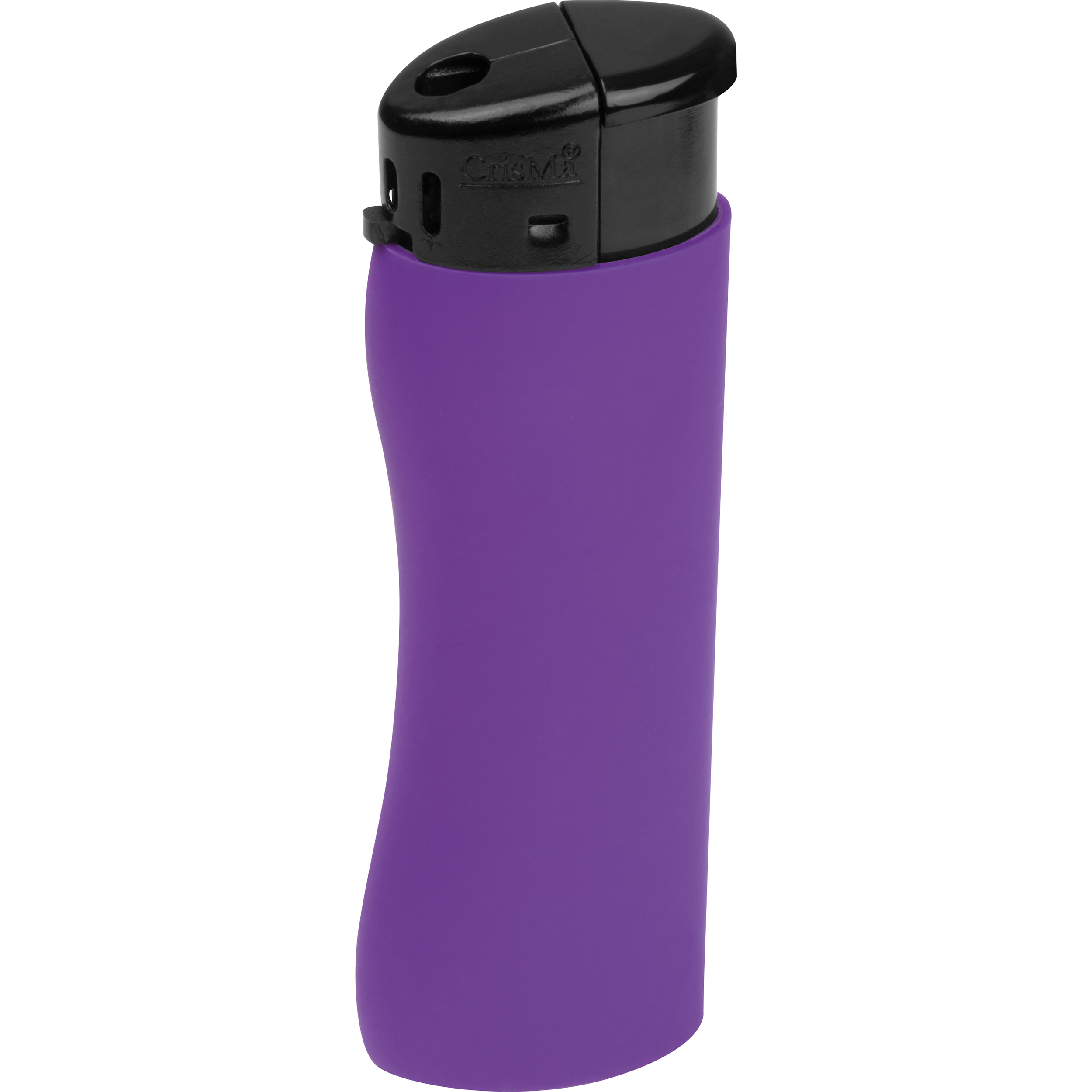 Ergonomisch geformtes Elektronikfeuerzeug mit gummierter Oberfläche, nachfüllbar. Die Flamme lässt sich stufenlos verstellen. Der Werbeaufdruck wird im Digitaldruck (mehrfarbig) für Rechtshänder lesbar angebracht.