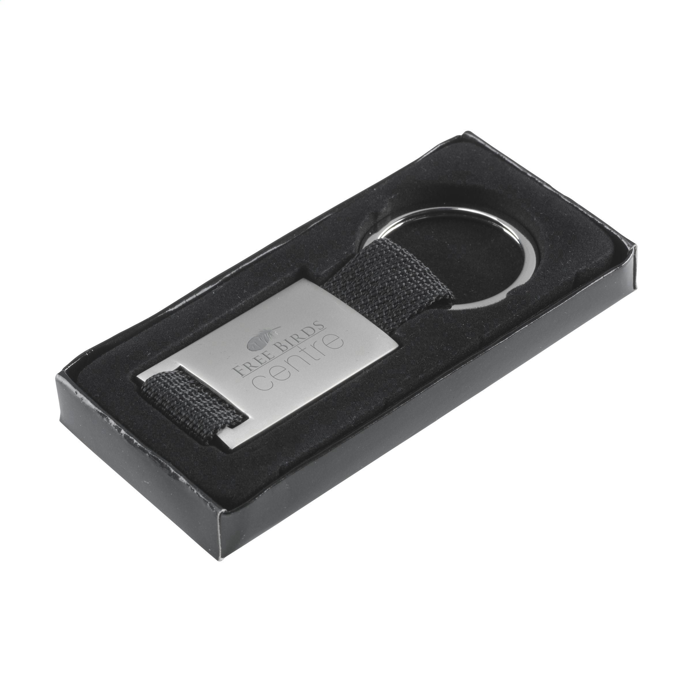 Schlüsselanhänger aus mattem Stahl mit einem stark gewebten Nylonriemen und Schlüsselring.