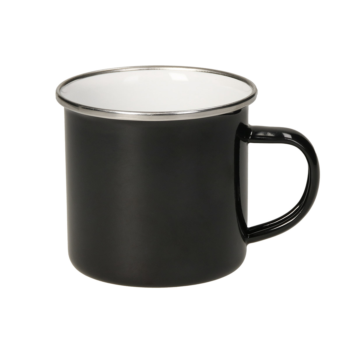 Stylischer Retro-Stahl-Kaffeebecher mit Emaille-Beschichtung und einem Tassenrand aus Edelstahl. Außenfarbe: schwarz. Innenfarbe: weiß. Füllmenge: 0,3 Liter.