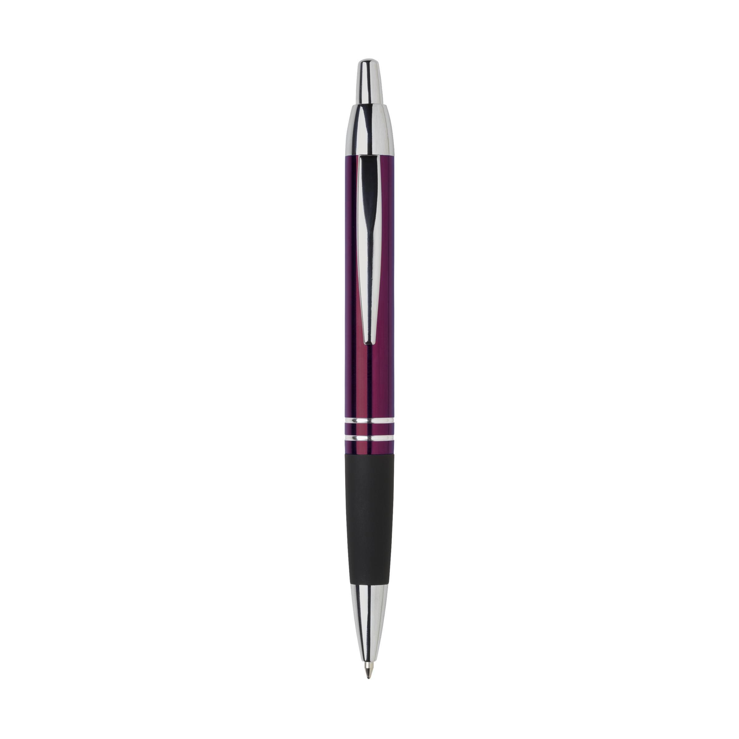 Beschreibung: Blauschreibender, metallener Kugelschreiber mit hochglänzendem Gehäuse in Metalloptik, gummierte Grifffläche, fester Metallclip und Druckknopf und silberfarbene hochglänzende Akzente.
