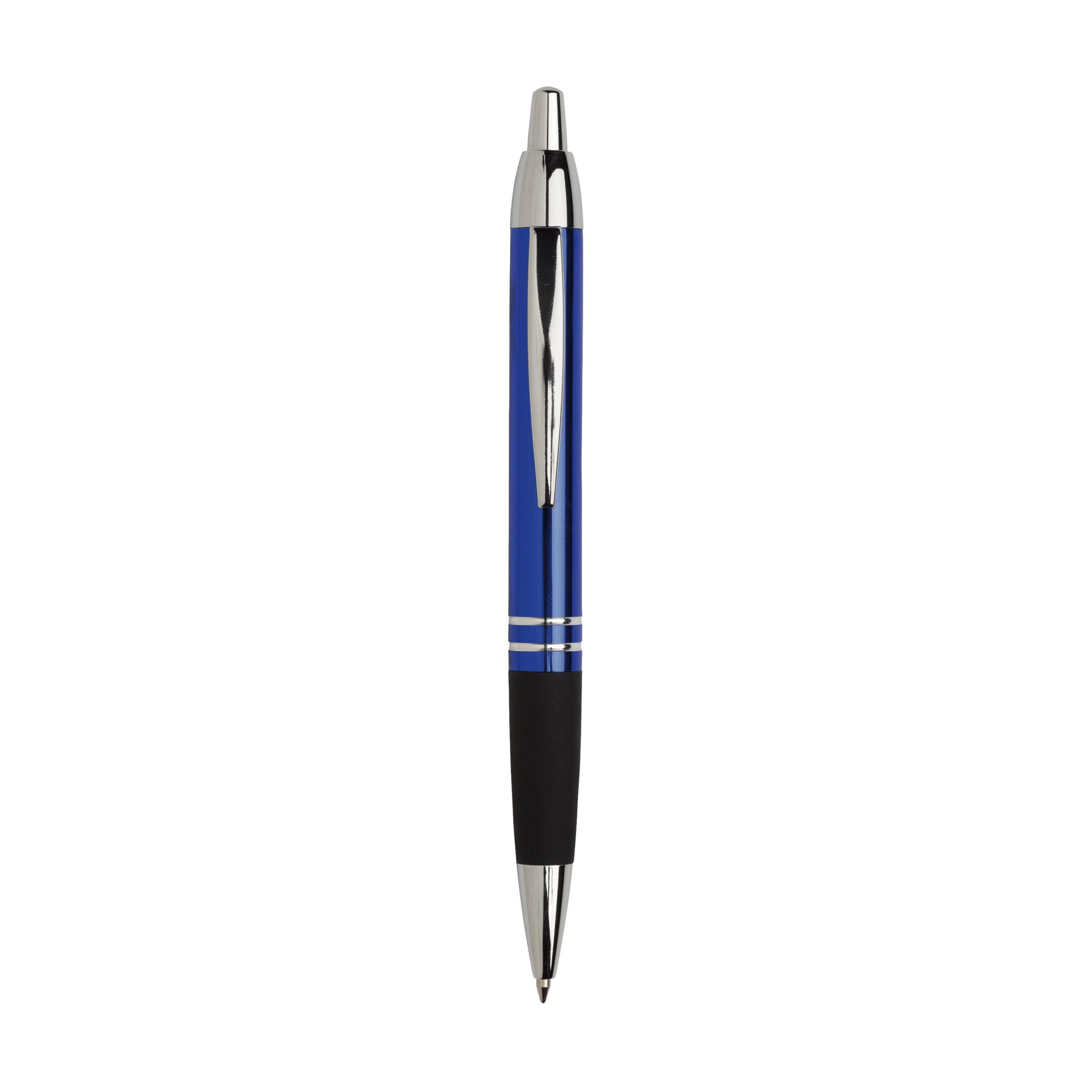 Beschreibung: Blauschreibender, metallener Kugelschreiber mit hochglänzendem Gehäuse in Metalloptik, gummierte Grifffläche, fester Metallclip und Druckknopf und silberfarbene hochglänzende Akzente.