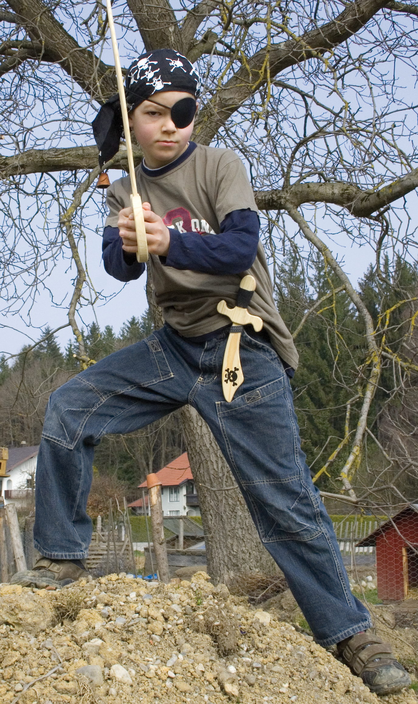 Die hölzerne Spielzeugwaffe hat einen mit Stoffband umwickelten Griff.