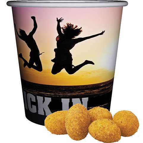 Snackbecher Mini aus Papier. Werbeanbringung als Direktdruck in 4c individuell bedruckbar. Zutaten Erdnüsse Paprika: Erdnüsse 56%, Kartoffelstärke, Palmfett, modifizierte Kartoffelstärke, Zucker, Soja, Gewürzmischung (Salz, Knoblauchpulver, Aroma und Geschmacksverstärker: Natriumglutamat, Farbstoff Paprikaextrakt, Trennmittel, Siliciumdioxid). Kann Spuren anderer Nüsse enthalten.