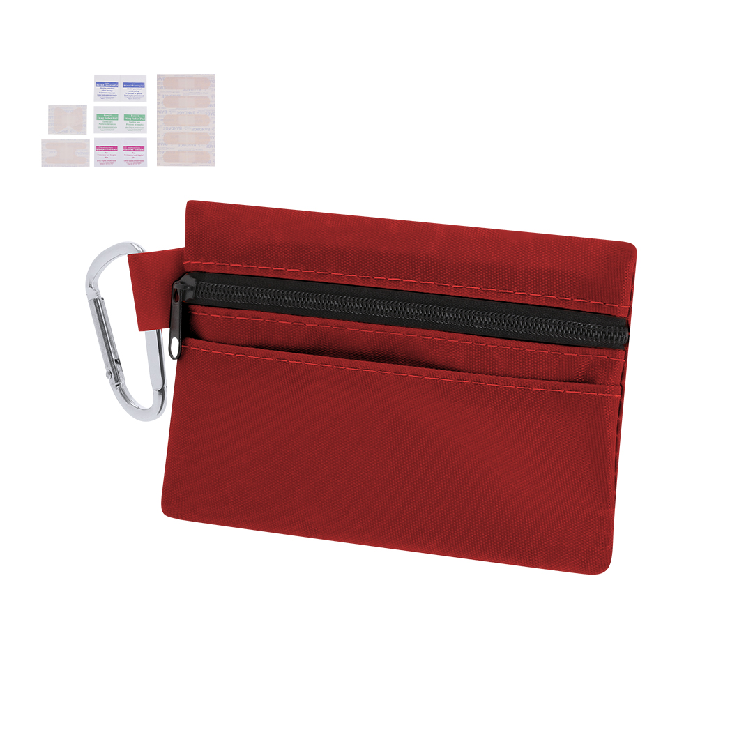 Notfallset mit 14 Zubehörteilen in einem strapazierfähigen 600D-Polyesteretui mit Reißverschluss, Fronttasche und Metallkarabiner. Enthält Verbände, Tücher, alkoholhaltige Tücher und Juckreizlindernde Tücher.