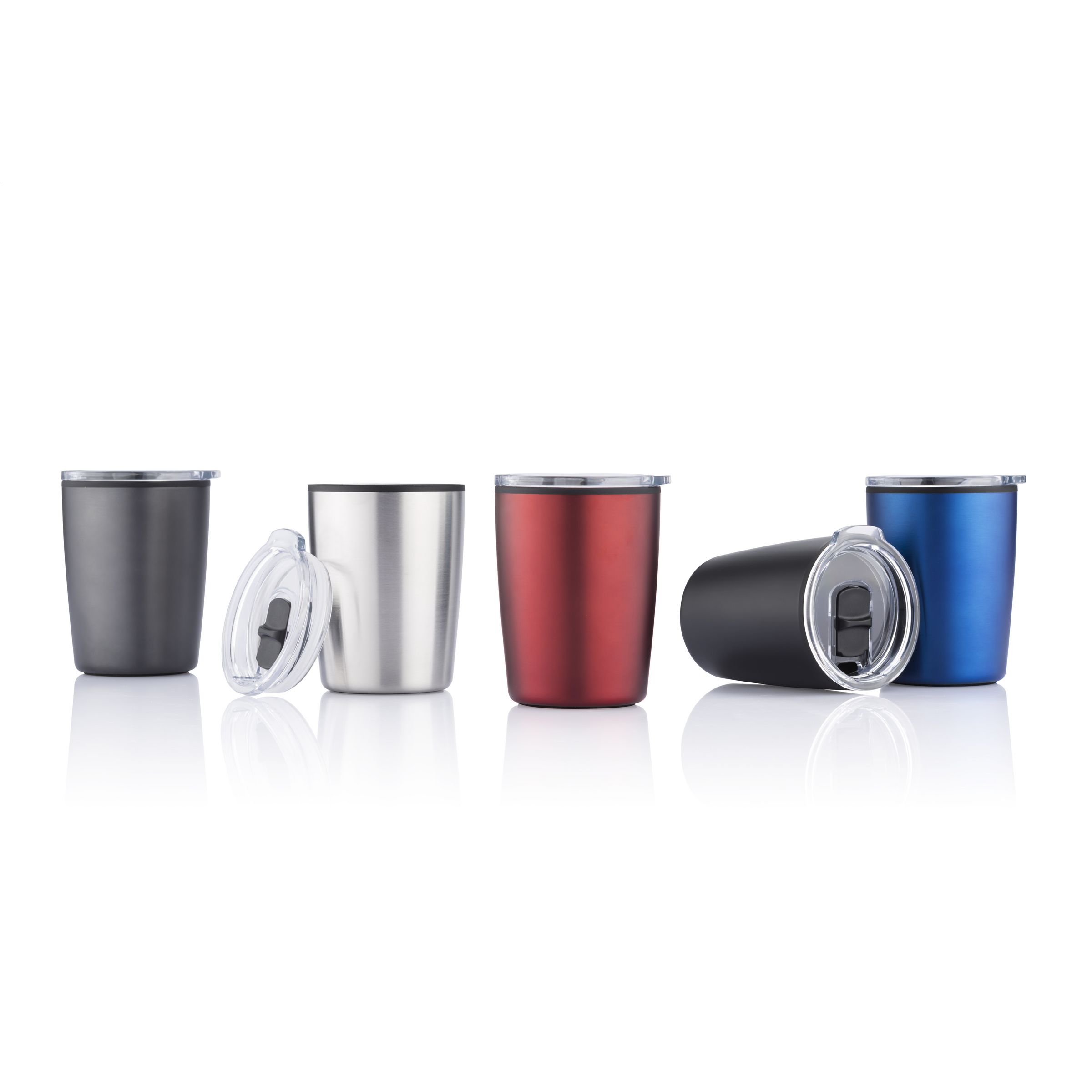 WoW! Doppelwandiger Espresso-Thermobecher aus recyceltem Edelstahl. Mit Kunststoff-Innenwand und transparentem Aufsteckdeckel mit verschließbarer Trinköffnung. Durch seine Form und begrenzte Höhe passt er perfekt unter Ihre Kaffeemaschine und in Ihr Auto. Rutschfeste Unterseite. Nicht spülmaschinengeeignet. Fassungsvermögen 170 ml. RCS-zertifiziert. Gesamtes recyceltes Material: 47%. E delstahl kann viele Male recycelt werden – die Qualität des Materials bleibt dabei weitgehend erhalten. Durch die Verwendung von recyceltem Edelstahl kommt eine geringere Menge an neuen Rohstoffen zum Einsatz. Das bedeutet weniger Energieverbrauch und weniger Wasserverbrauch. Wird einzeln in einem Kraftkarton geliefert.