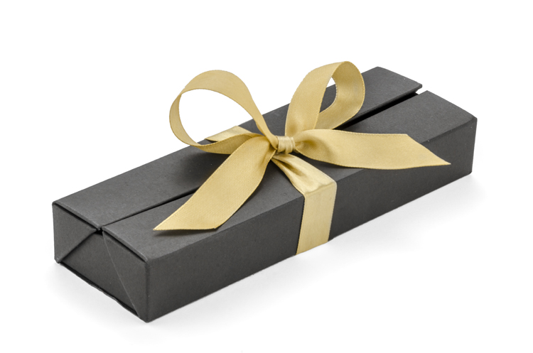 Etui zum Einpacken von Schreibwaren, aus Papier hergestellt. Geschlossen mit einem Band, dass man in eine dekorative Schleife binden kann.