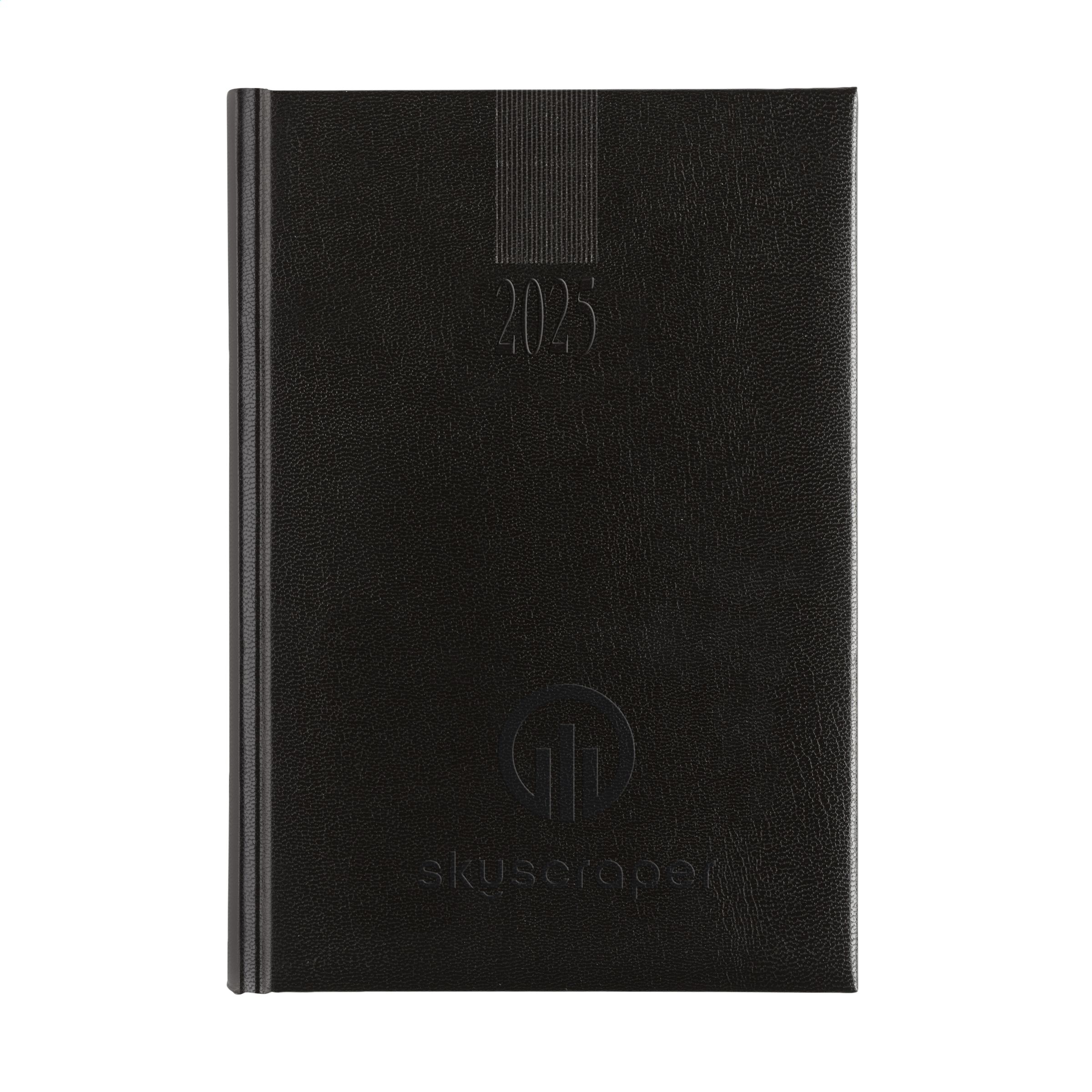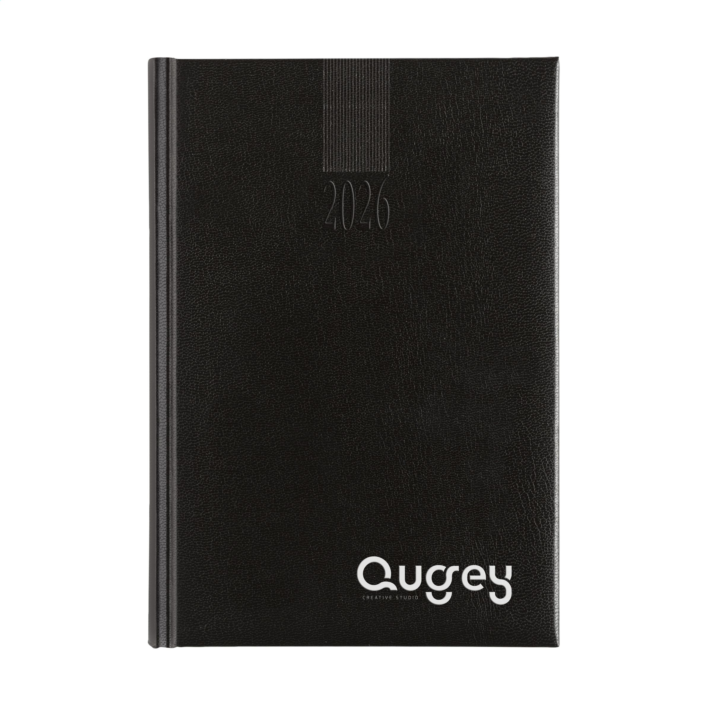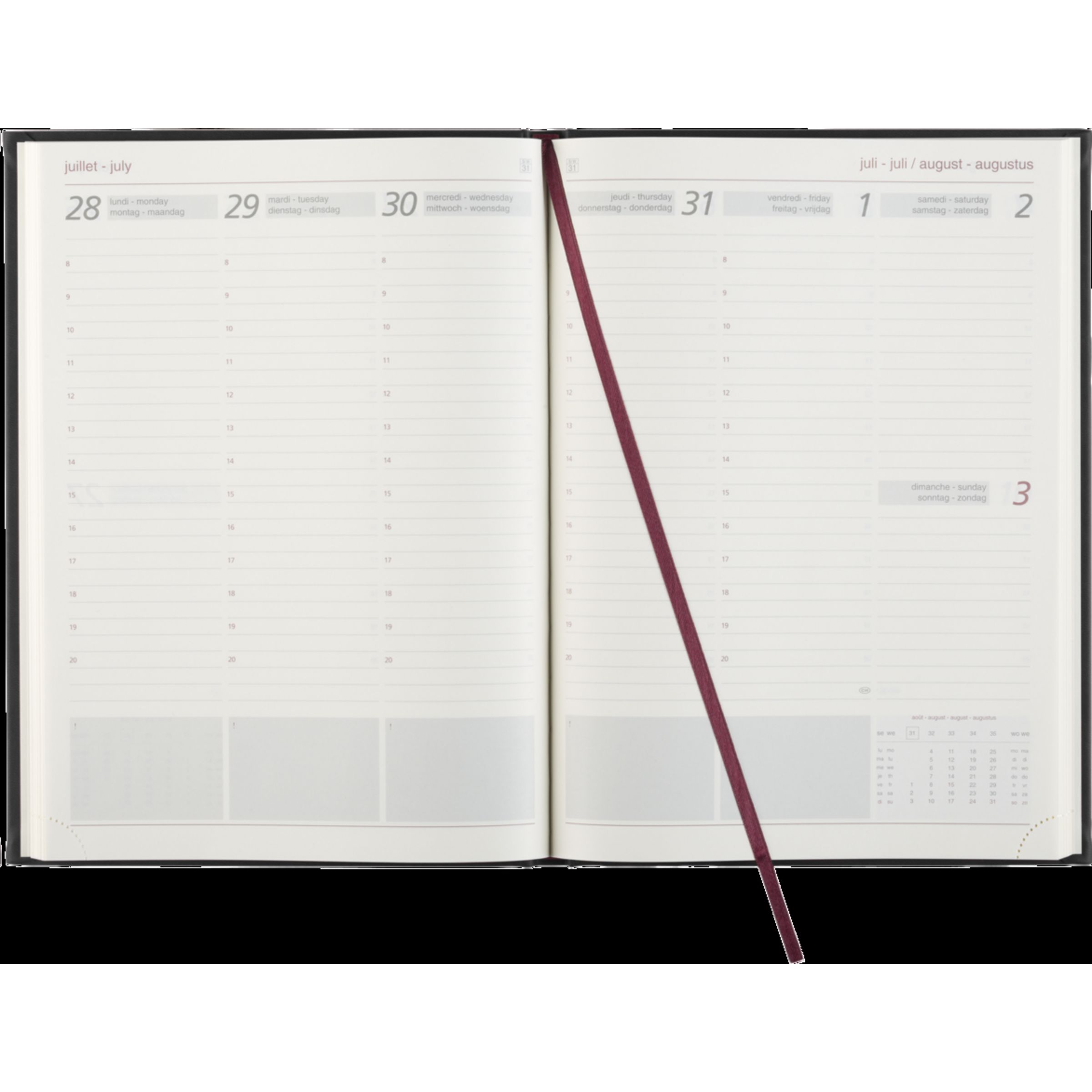 Bürokalender, viersprachig: D, GB, F und NL. Mit stark wattiertem Umschlag mit der Jahreszahl in Blinddruck auf der Vorderseite. 2-Farbendruck, garngebunden, 144 Seiten 80 g. crèmefarbenem, holzfreiem, FSC Mix zertifiziertes Schreibpapier, großzügige Wochenübersicht über 2 Seiten, Monatsübersicht mit deutlicher Wochennummerierung, Jahresplaner des laufenden und des Folgejahres, seidene Leselitze und Adressregister. Viele zusätzliche Informationen u. a. Maß- und Gewichtstabelle, Zeitzonen und Ferienplaner.