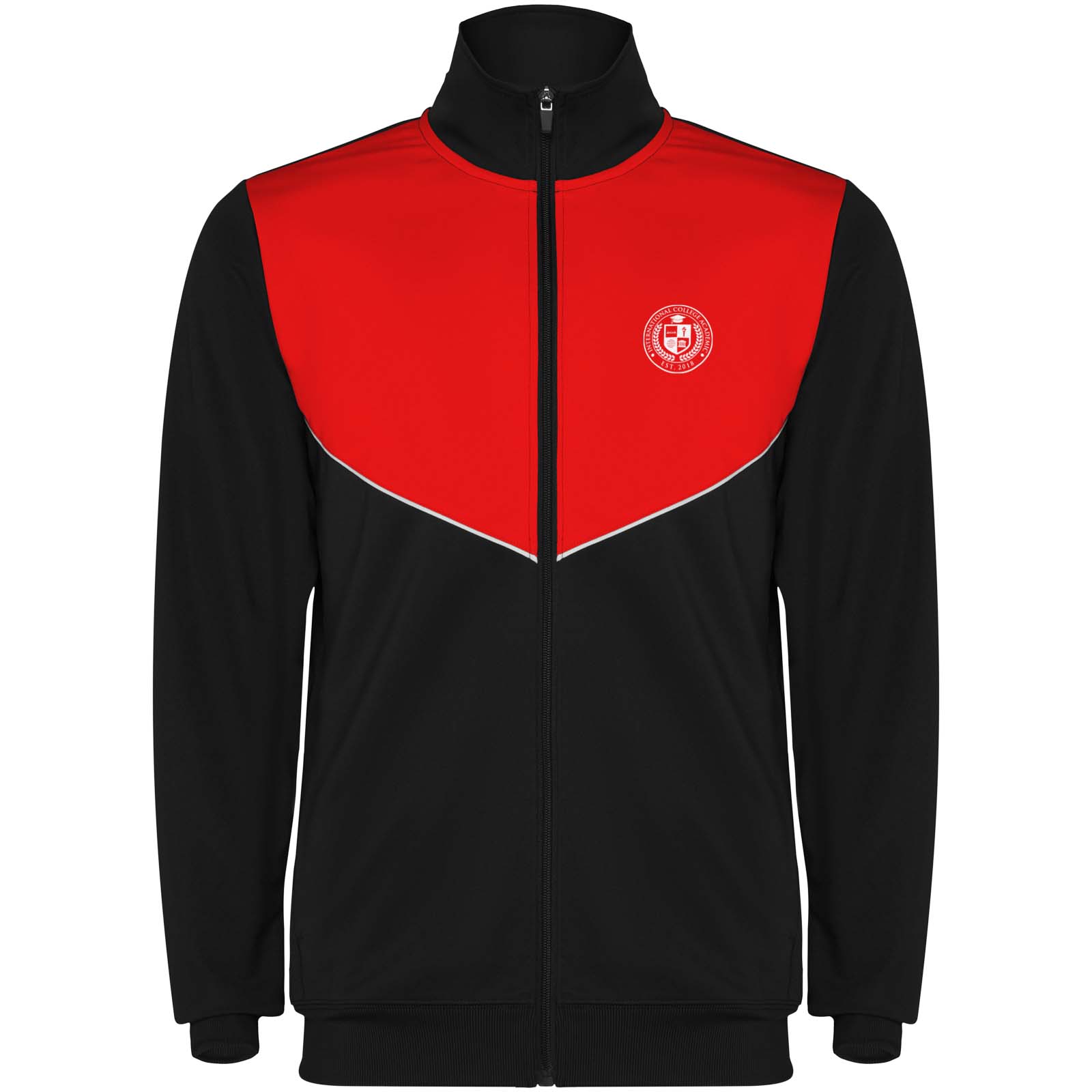 Trainingsanzug aus leichtem und elastischem Stoff. Jacke mit farblich abgesetzten Nähten im Brustbereich. Hoher Kragen mit Kontrastnähten. Zentraler Frontreißverschluss. Seitentaschen. 2 x 2-Rippenbündchen an Ärmeln und Bund. Hose mit elastischem Bund und Kordelzug. Seitliche Kontrasteinsätze mit Steppnaht. Beinsaum mit Reißverschluss.
