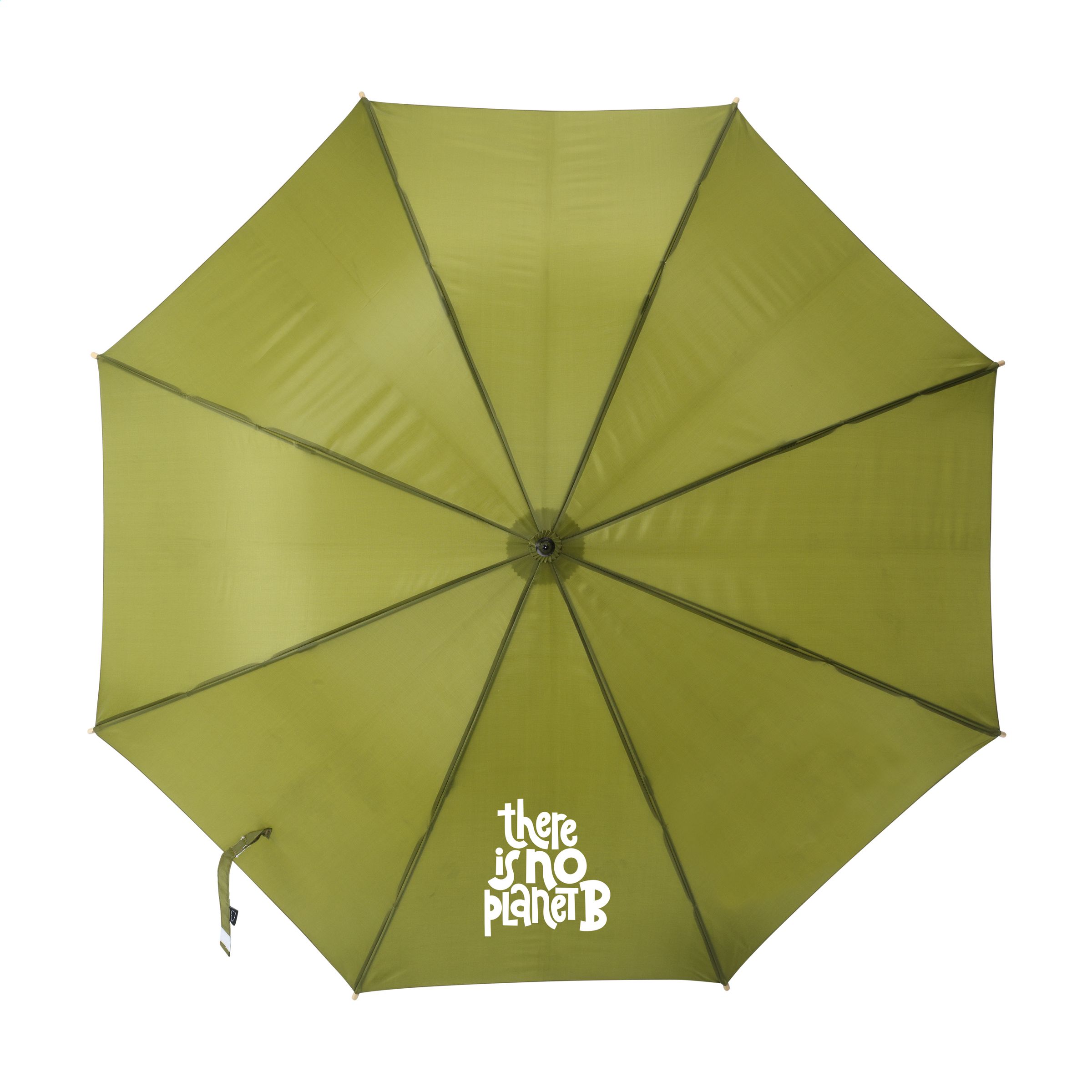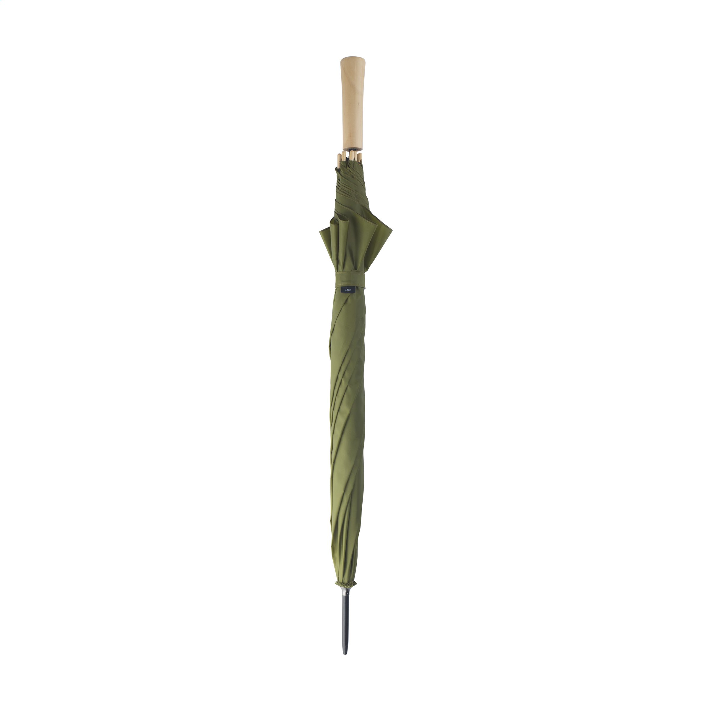 WoW! Regenschirm mit einem RPET 190T Pongee-Polyester-Bespannung. Dieser Regenschirm hat einen Metallschaft und ein Gestell aus Glasfaser. Mit Holzgriff und Klettverschluss. RCS-zertifiziert. Recyceltes Material insgesamt: 16%.