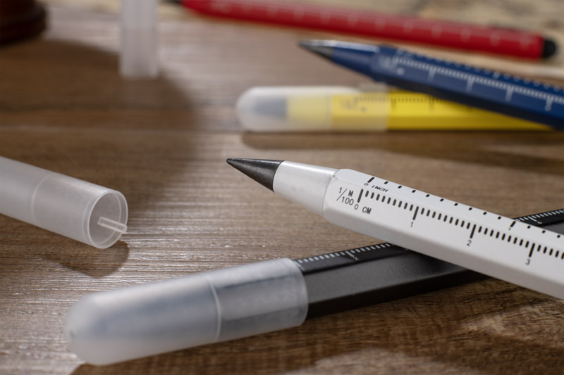 Der DRAWI Ewiger Bleistift ist ein praktisches Werbegeschenk aus recyceltem Aluminium mit lackierter Oberfläche. Ausgestattet mit einem 11 cm langen Maßband mit Zentimeter- und Inch-Teilung und einem Touch-Pen, wird er sich im Büro, in der Technik und im Baugewerbe als nützlich erweisen. Das sechseckige Gehäuse liegt gut in der Hand und verhindert, dass der Stift vom Tisch rollt. Ein Kunststoffstopper schützt die Spitze und erhöht den Komfort. Durch das kompakte Format ist der DRAWI immer griffbereit und dank seiner Beschriftungsmöglichkeiten ein robuster Werbeträger.