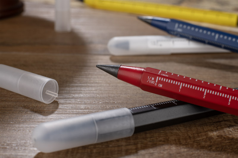 Der DRAWI Ewiger Bleistift ist ein praktisches Werbegeschenk aus recyceltem Aluminium mit lackierter Oberfläche. Ausgestattet mit einem 11 cm langen Maßband mit Zentimeter- und Inch-Teilung und einem Touch-Pen, wird er sich im Büro, in der Technik und im Baugewerbe als nützlich erweisen. Das sechseckige Gehäuse liegt gut in der Hand und verhindert, dass der Stift vom Tisch rollt. Ein Kunststoffstopper schützt die Spitze und erhöht den Komfort. Durch das kompakte Format ist der DRAWI immer griffbereit und dank seiner Beschriftungsmöglichkeiten ein robuster Werbeträger.