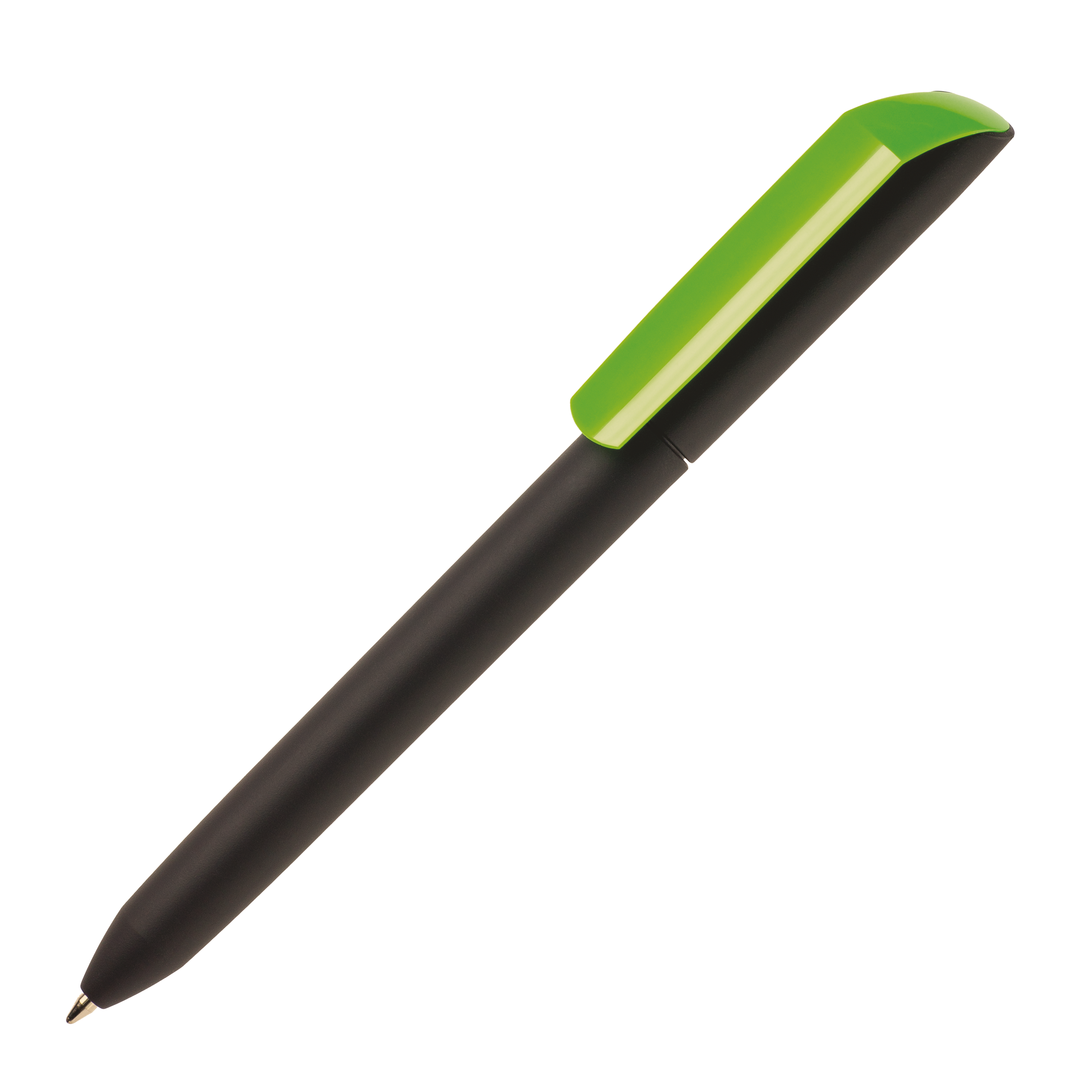 FLOW PURE F2P GOM KF Kugelschreiber Maxema, deckende Farben, gummiertes Gehäuse und Kappe in schwarz, Clip in fluo Farben mit Hochglanz-Finish, blauschreibend