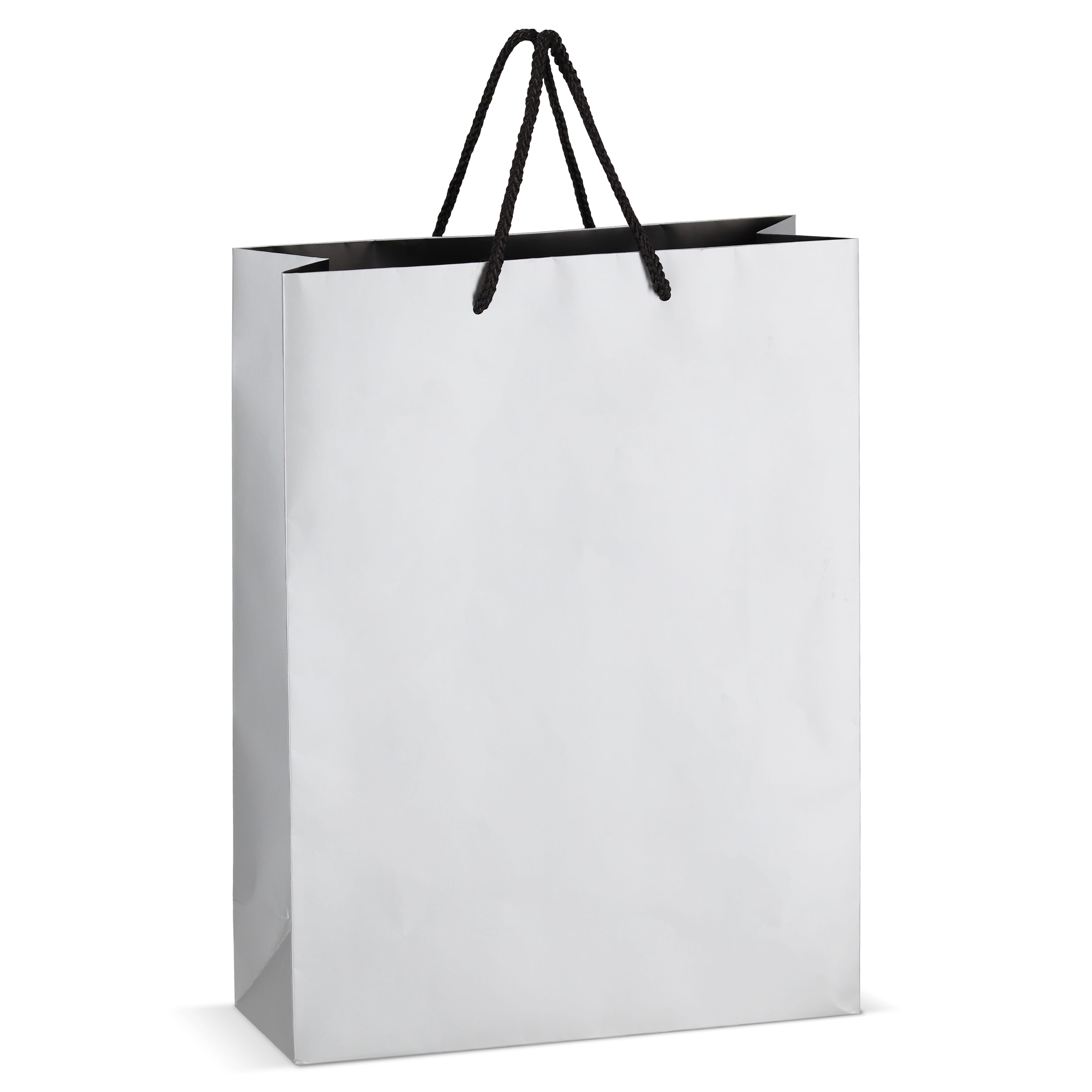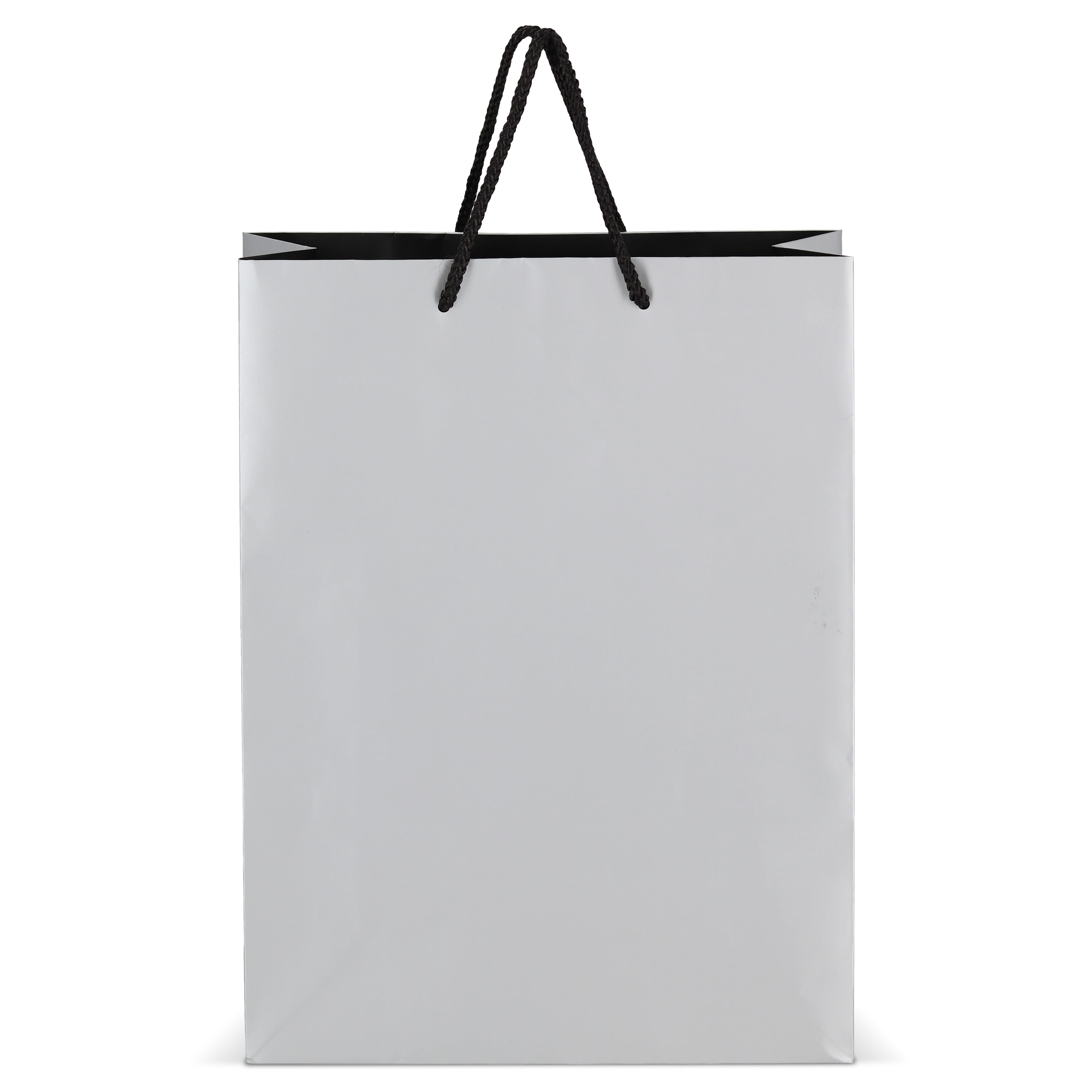 Elegante Geschenktasche aus FSC-zertifiziertem Papier mit 5 mm dicken Kordeln aus recyceltem Polyester. Sie ist für ein Gewicht von bis zu 5 kg ausgelegt und hat ein luxuriöses Aussehen mit schwarzen Griffen und einer schwarzen Innenseite. Perfekt zum Überreichen von Geschenken.