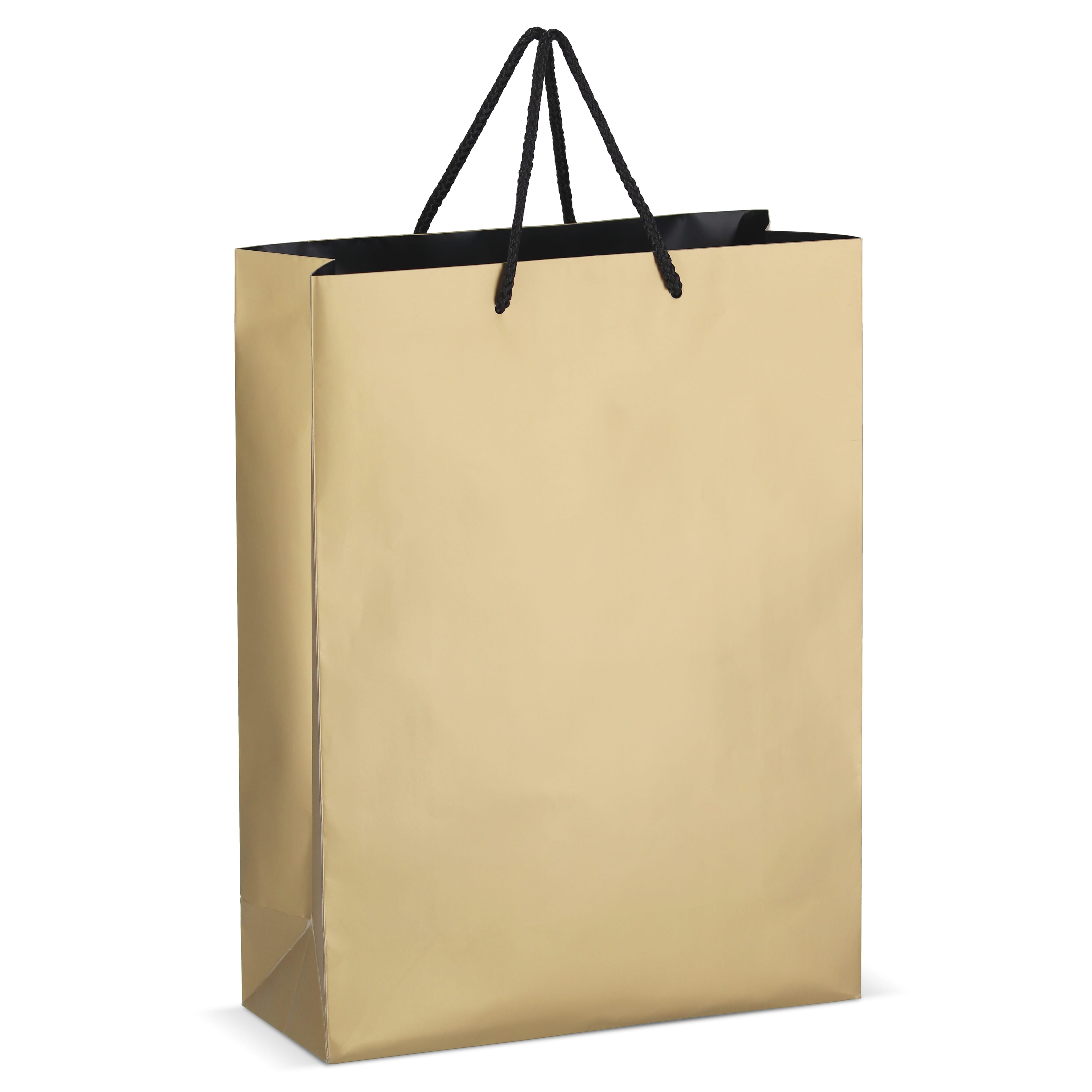 Elegante Geschenktasche aus FSC-zertifiziertem Papier mit 5 mm dicken Kordeln aus recyceltem Polyester. Sie ist für ein Gewicht von bis zu 5 kg ausgelegt und hat ein luxuriöses Aussehen mit schwarzen Griffen und einer schwarzen Innenseite. Perfekt zum Überreichen von Geschenken.