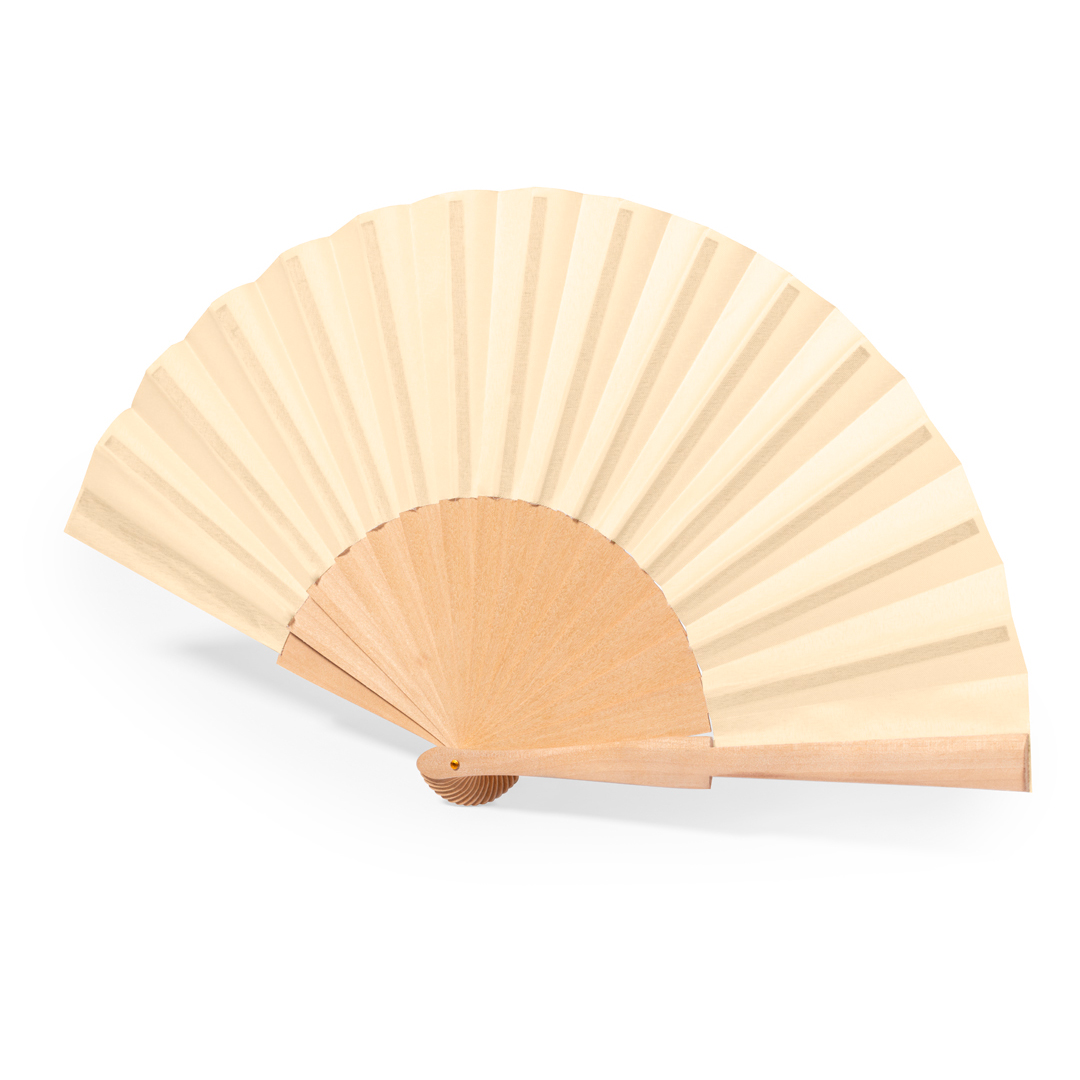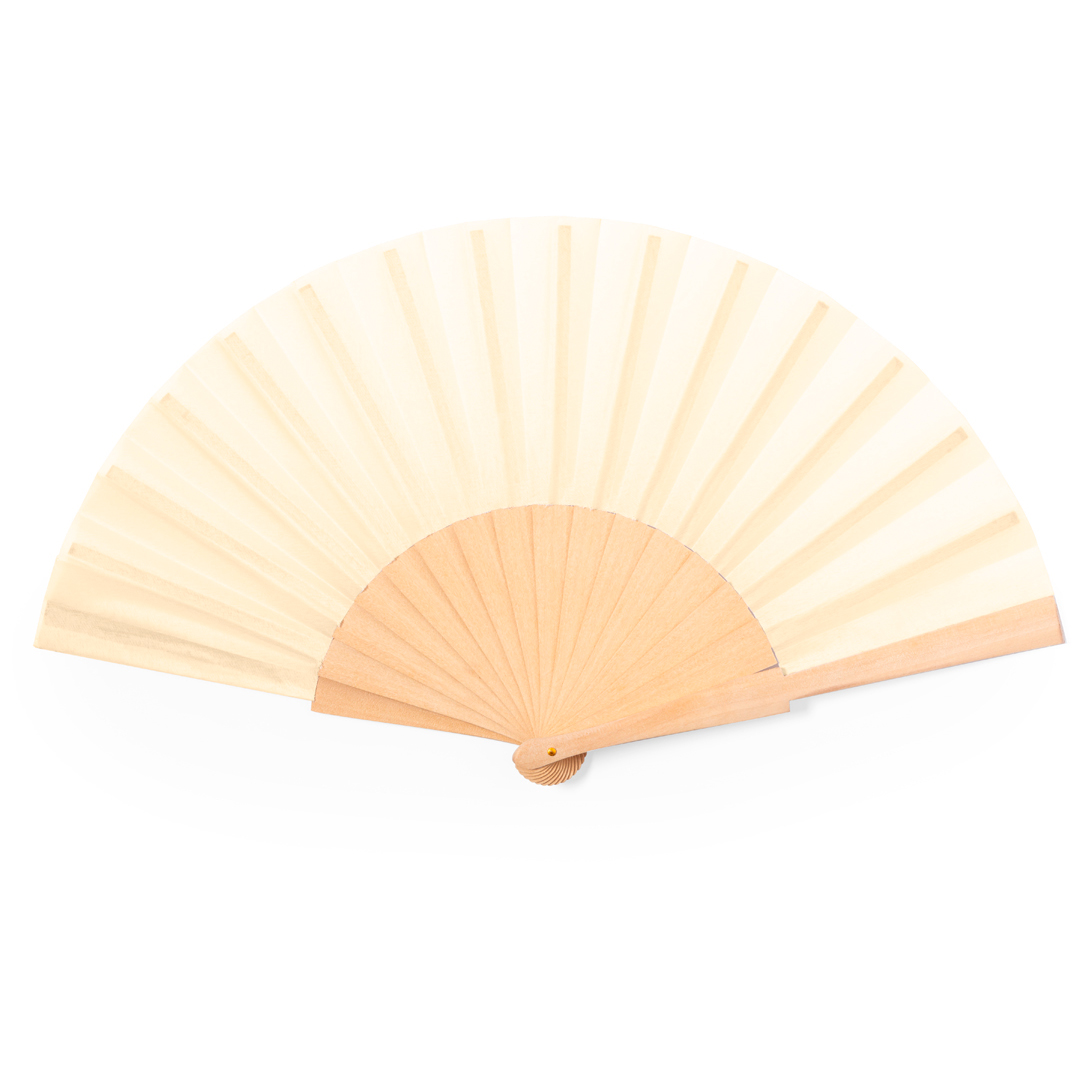 Fächer mit Holzrippen und Stoff aus einer Kombination von Baumwolle und Polyestermaterial. In natürlicher Farbe und präsentiert in einer individuellen Kraft-Design-Box.
