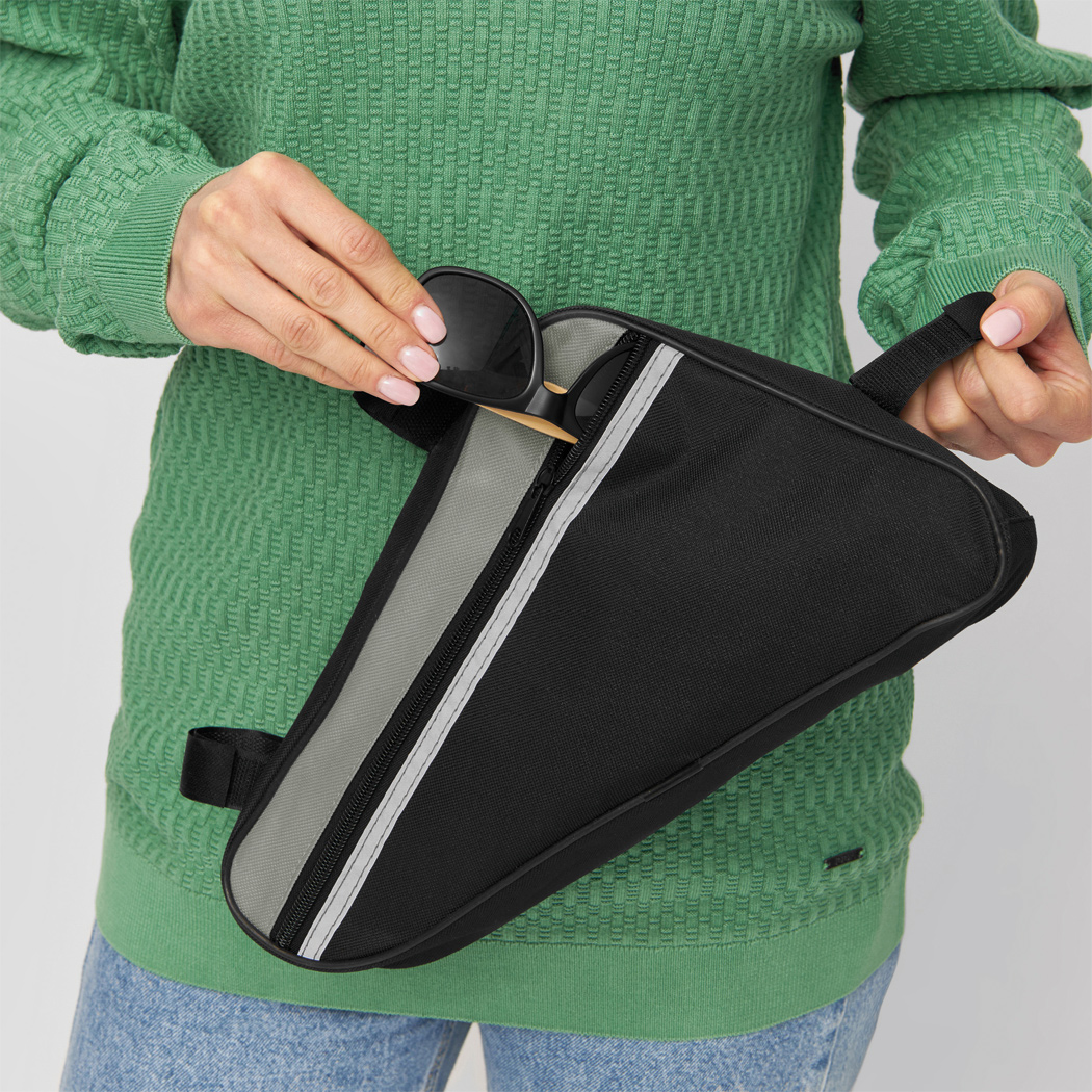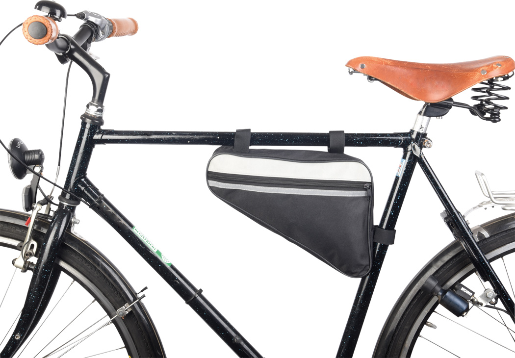 Fahrrad-Rahmentasche BIKE MASTER: mit Klettverschlussbändern zur Befestigung am Fahrradrahmen, Vorderseite mit Reflektorstreifen, Reißverschlussfach, innen mit Netzfach, großes Netzfach auf der Rückseite