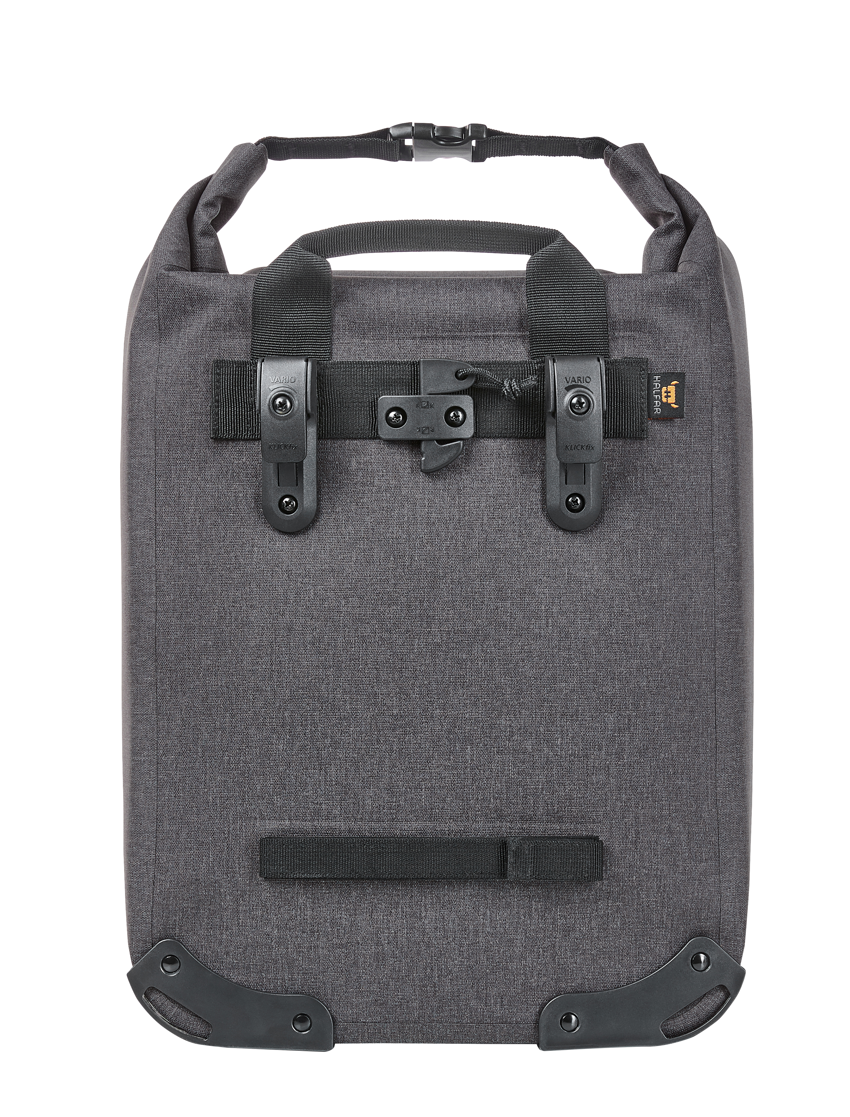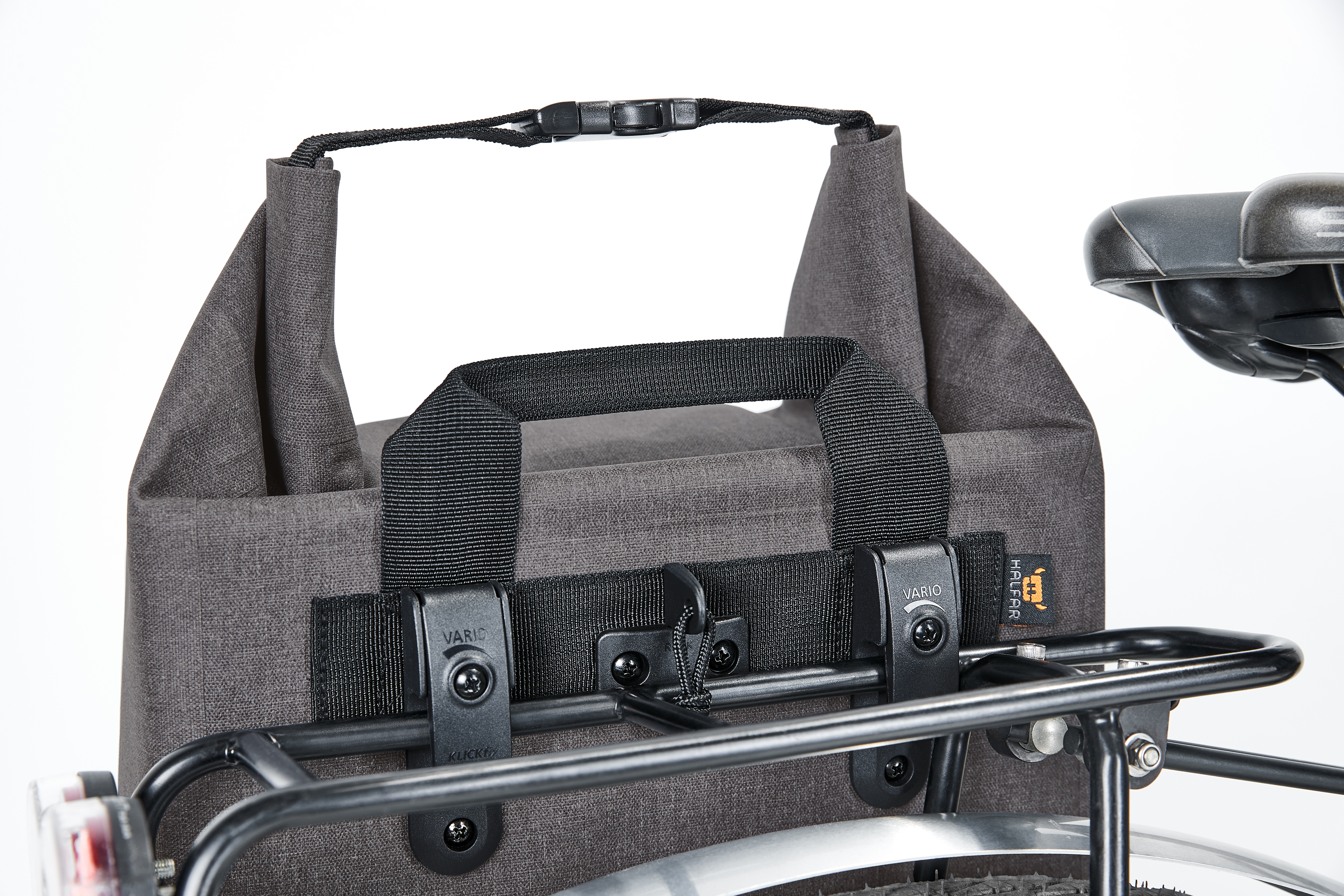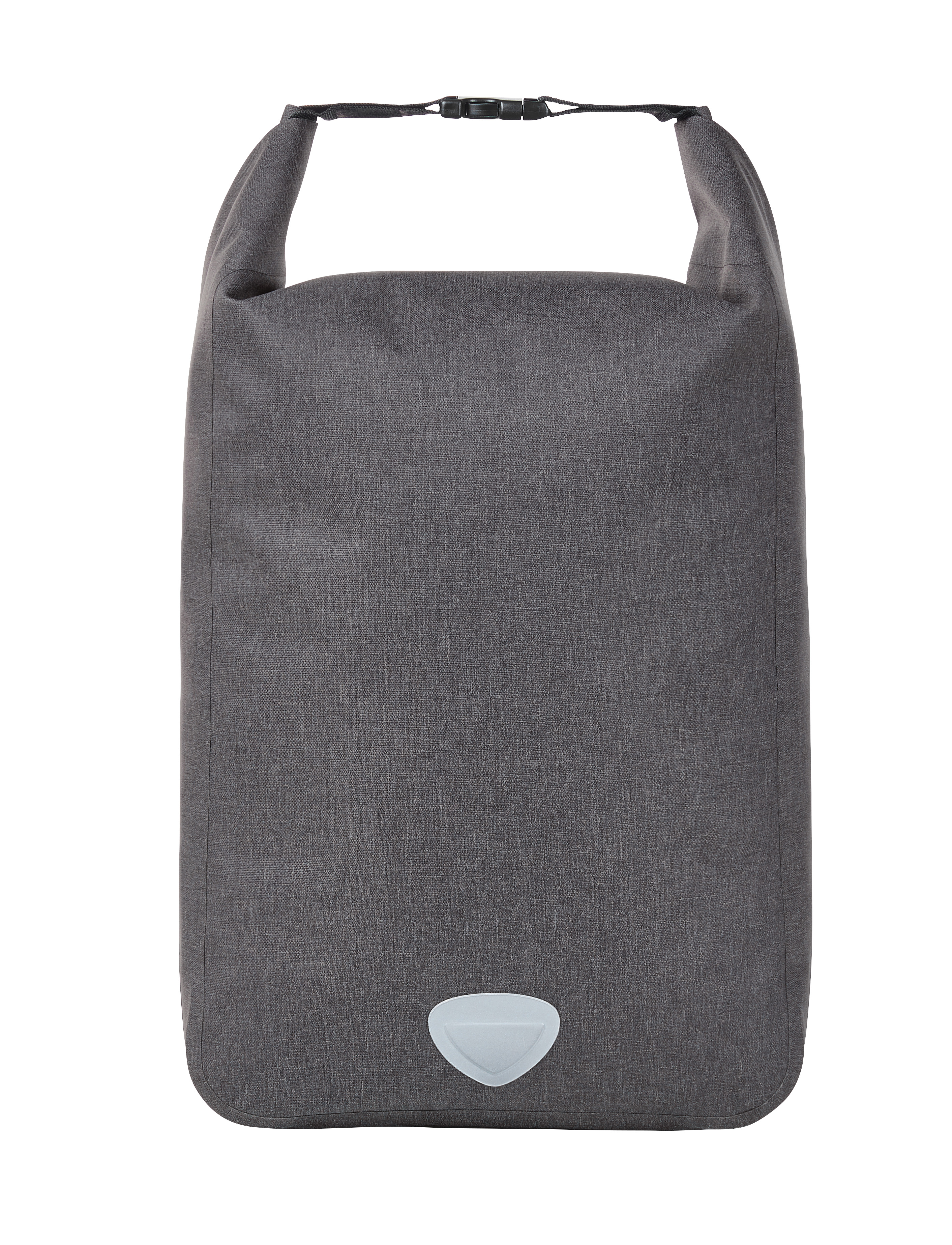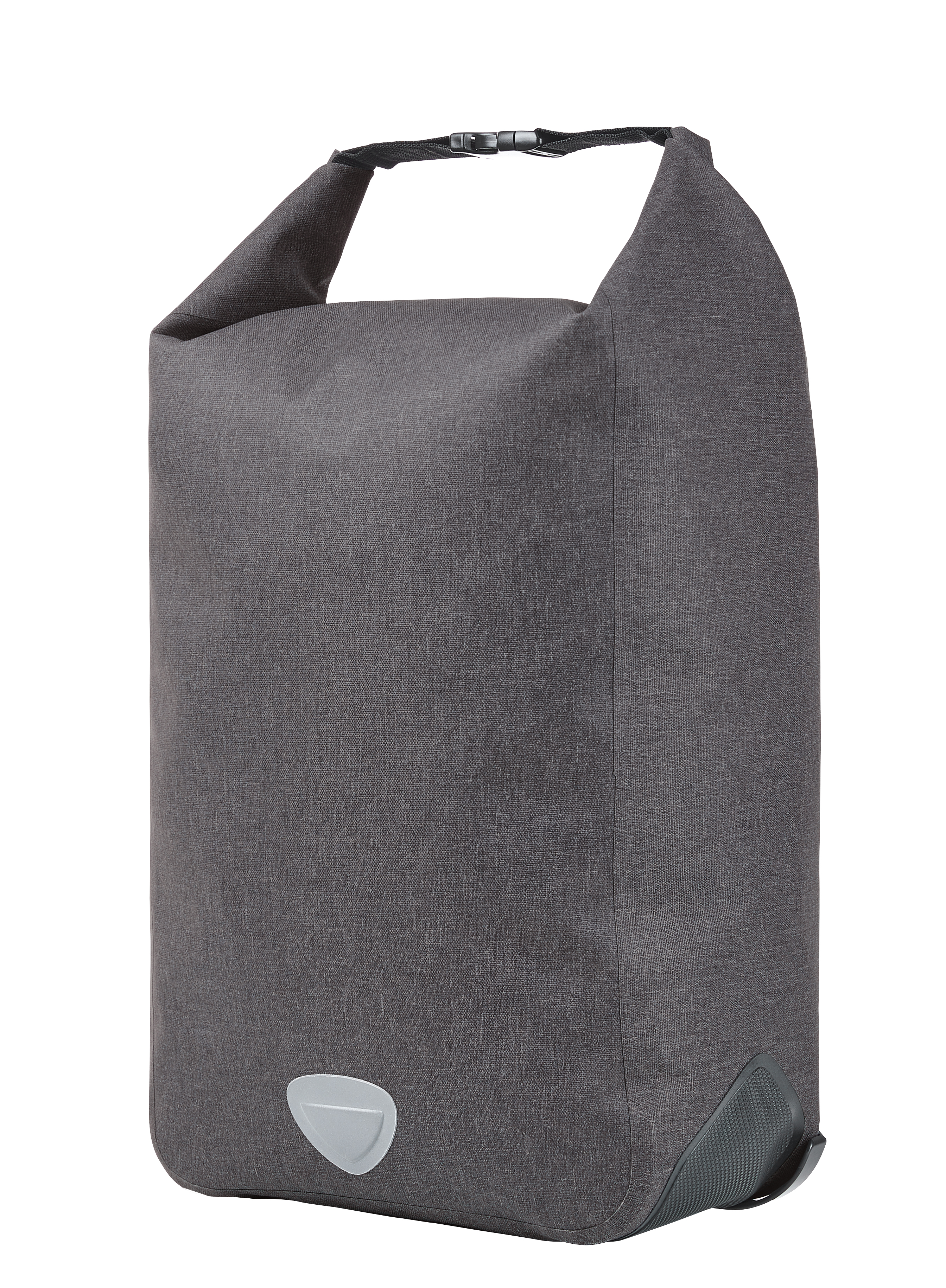 Urbane Fahrradtasche mit geräumigem Hauptfach; große Reißverschluss-Innentasche; Rolltop-Verschluss; geschweißte Nähte für zuverlässigen Schutz vor Regenwasser und Nässe; Boden- und Kantenschutz; individuell einstellbare Halterung zur Befestigung am Fahrrad-Gepäckträger mit Drehriegel zur Sicherung und Klettverschluss auf der unteren Taschenrückseite für zusätzliche Fixierung; dekorative Reflektorapplikation; Handgriff