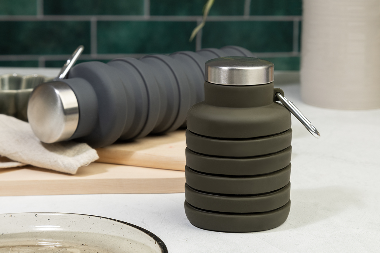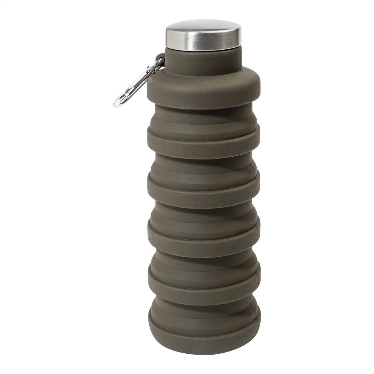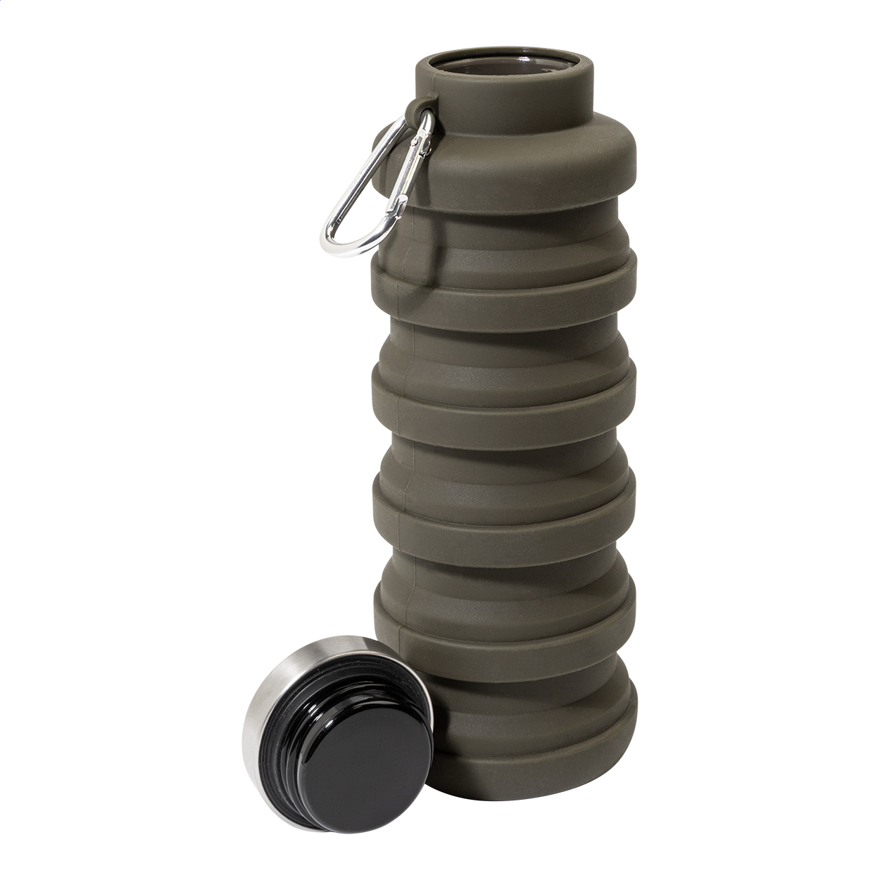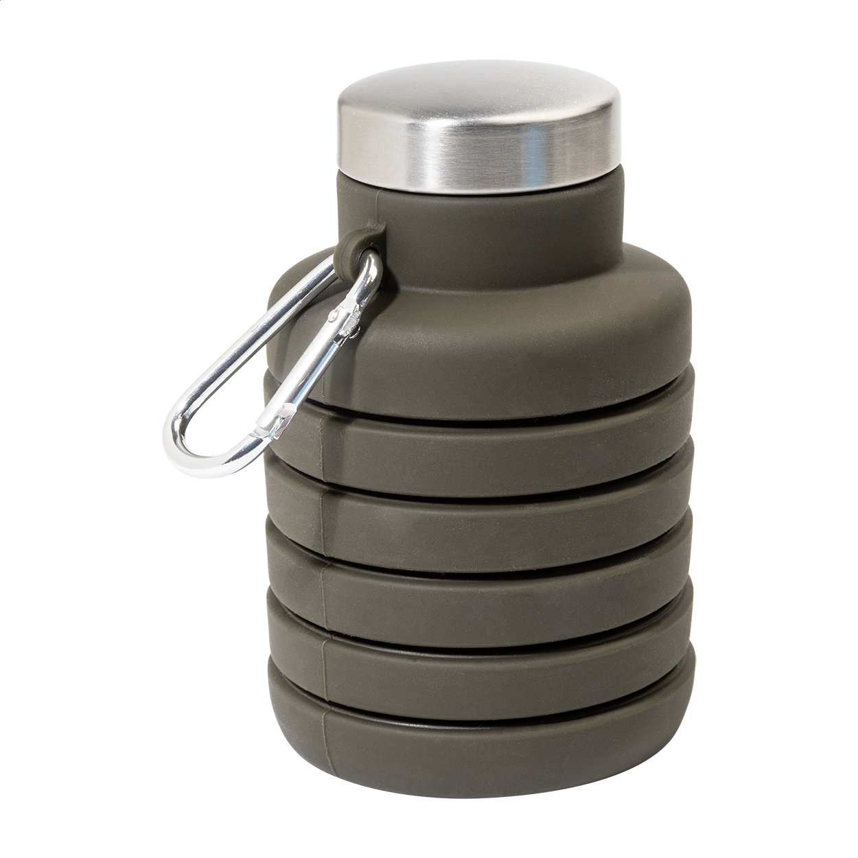 Faltbare Trinkflasche aus Silikon mit Deckel aus Edelstahl und Aluminium-Karabiner. Füllmenge: 500 ml.