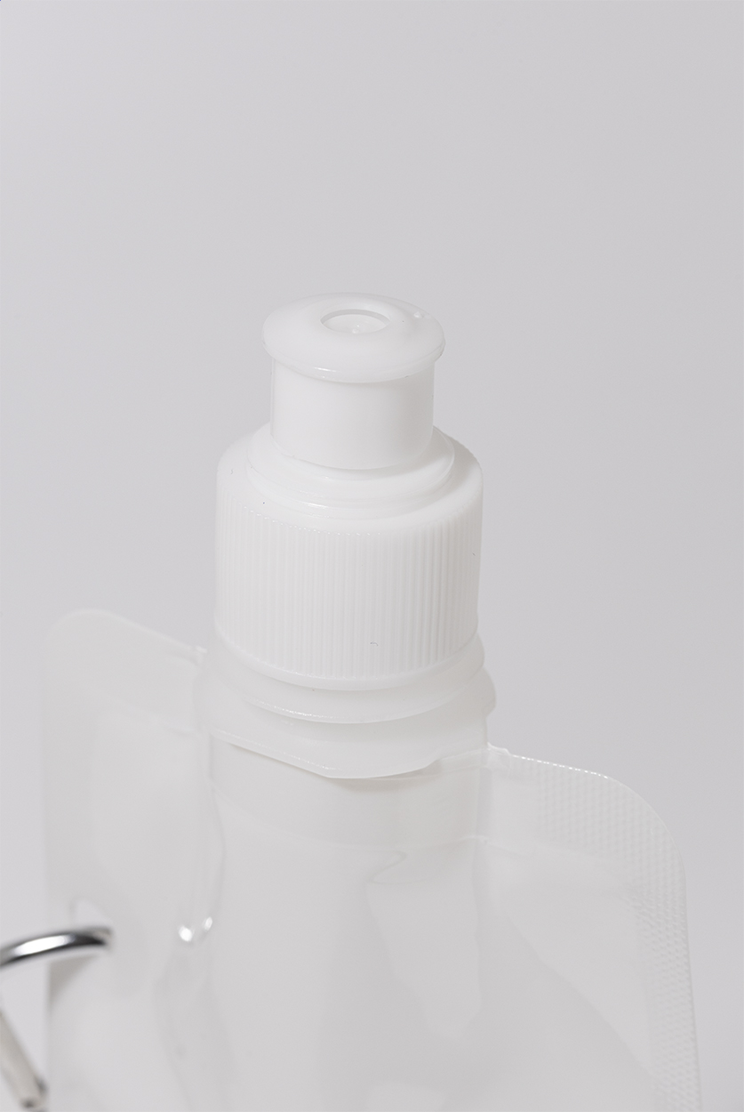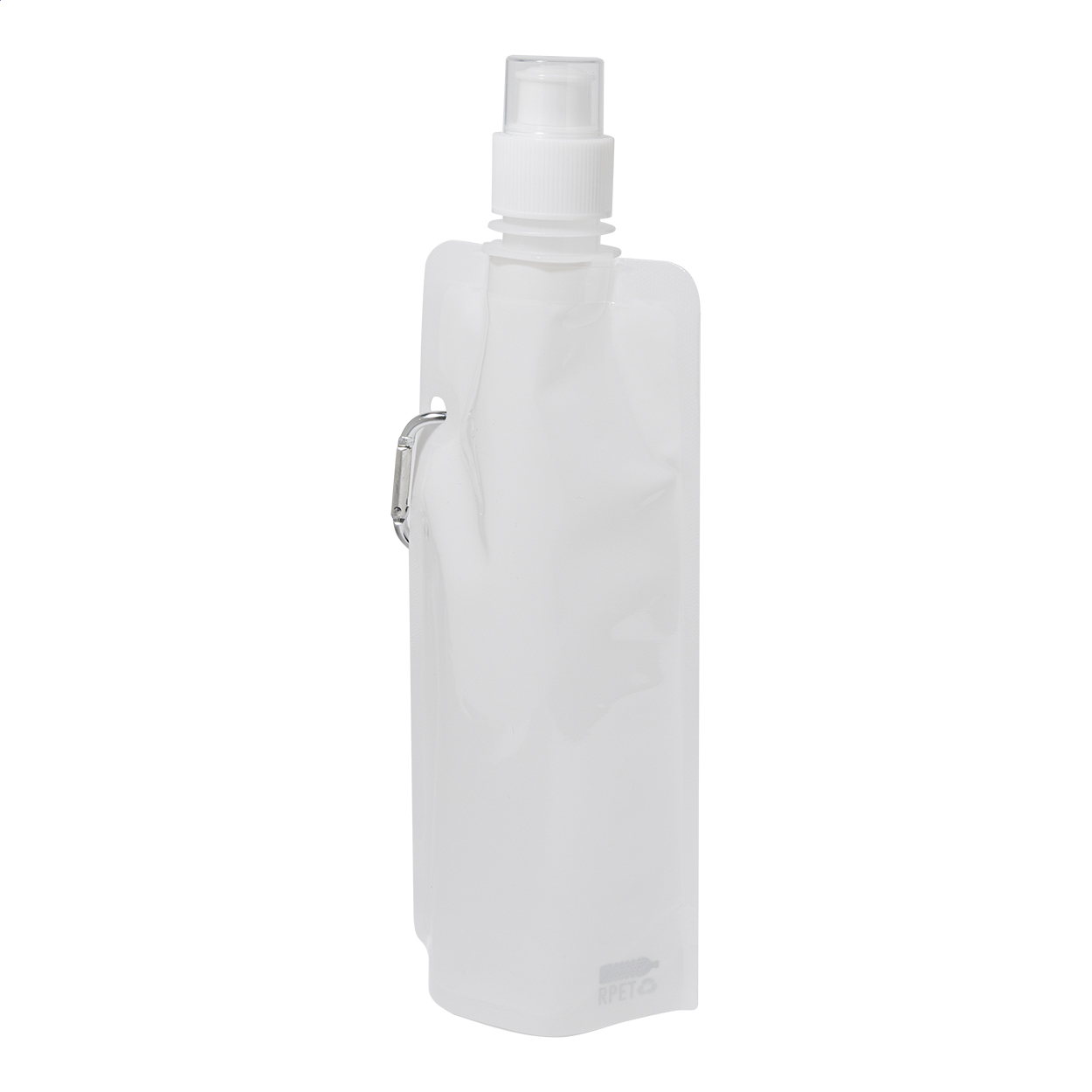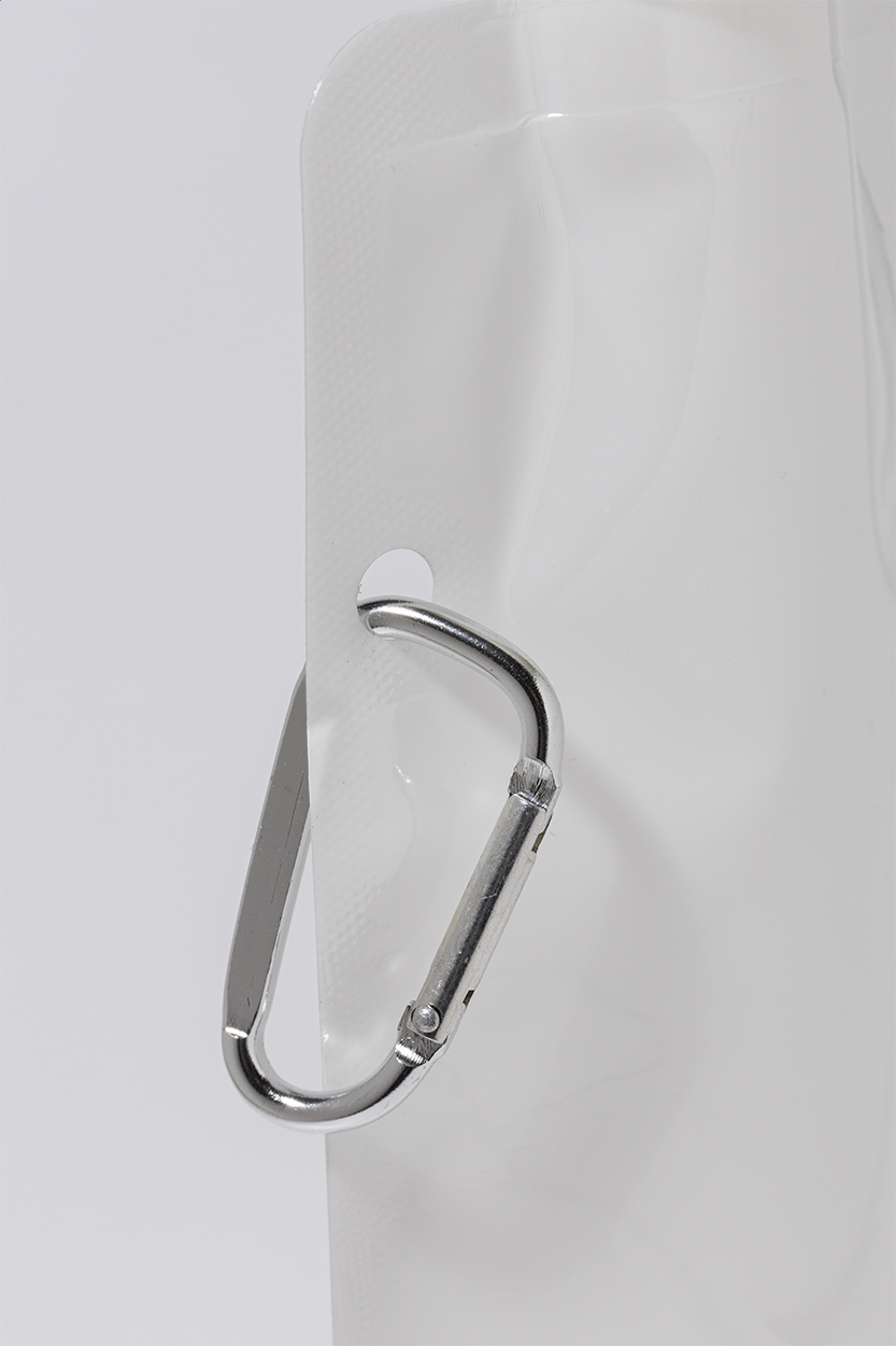 Faltbare RPET Trinkflasche mit Trinkdeckel und Karabiner aus Aluminium. Füllmenge: 500 ml. BPA-frei. Nicht geeignet für kohlensäurehaltige Getränke.